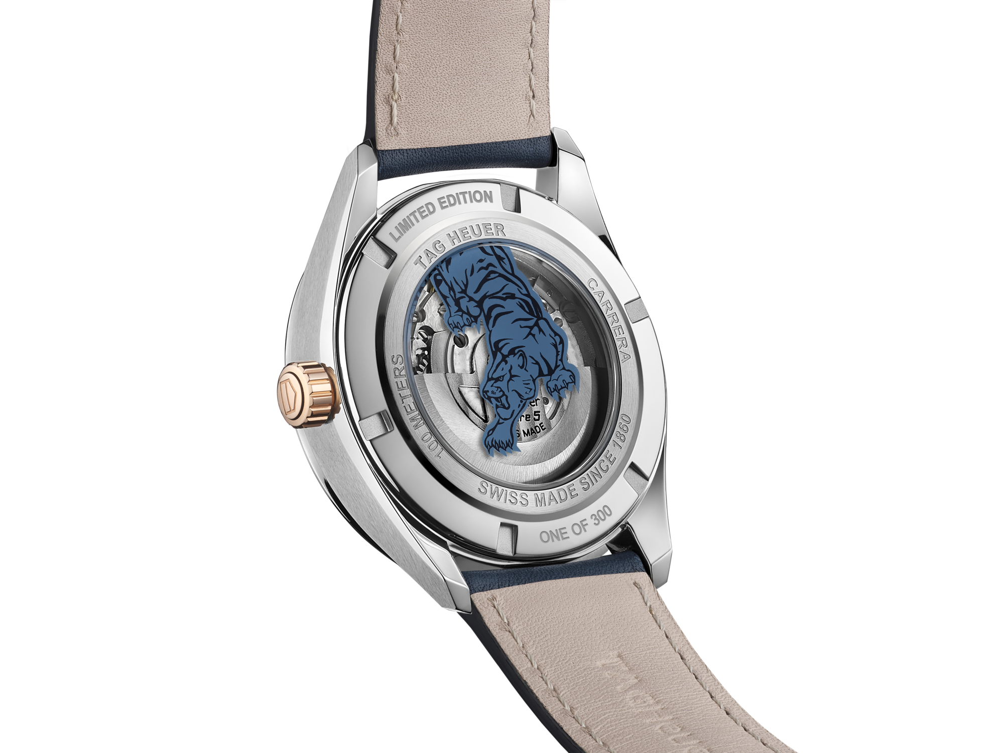 Water-resistant to 100M, the 41 mm steel case, with a 18K 5N solid rose gold crown, is topped by a domed sapphire crystal with double anti-reflective treatment. On the sapphire case back, a “LIMITED EDITION” engraving adds to an emblematic blue and black tiger decal.
