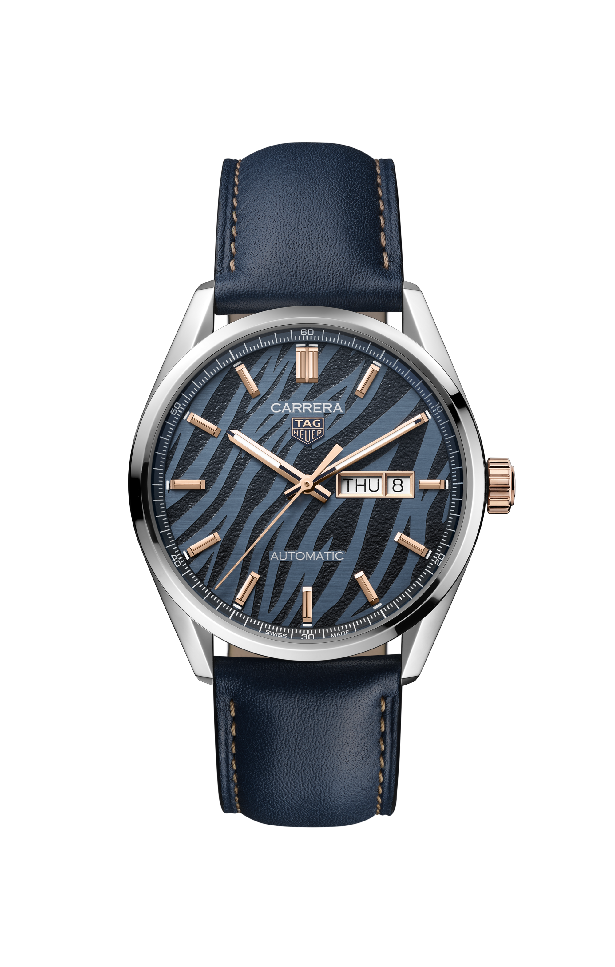 Confident and daring, the dial sports an intense blue dial with showy tiger stripes and a matching blue flange. Adorned with luxurious 18K 5N rose gold plated hands and indexes, it makes a statement of striking luxury.