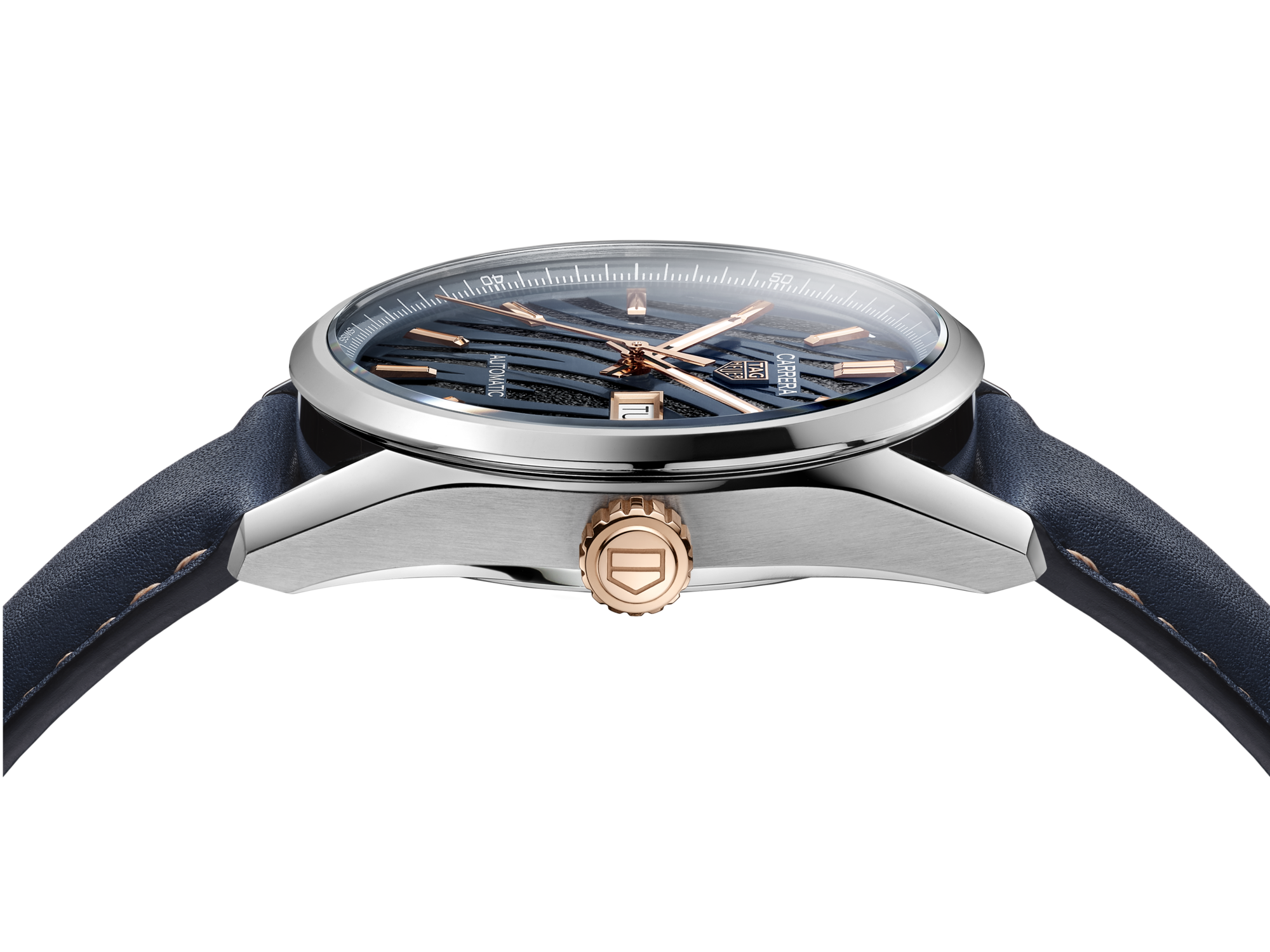 Crafted out of blue calfskin leather, the bracelet shows a rose gold color stitching and an applied TAG Heuer logo. The steel folding clasp with double safety push buttons brings extra confidence on the go.
