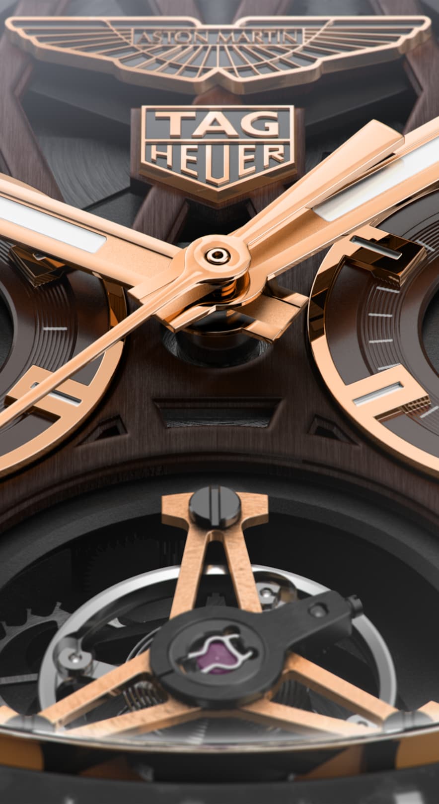 Automatic, 45 mm, Titanium Carbon CAR5A8E.FT6181This 45mm COSC-certified tourbillon chronometer is a Aston Martin x TAG Heuer Carrera limited-edition who pairs a brown dial with rose-gold plated (5N) accents. Motor-racing purists will appreciate the matching brown strap, made from the Aston Martin car