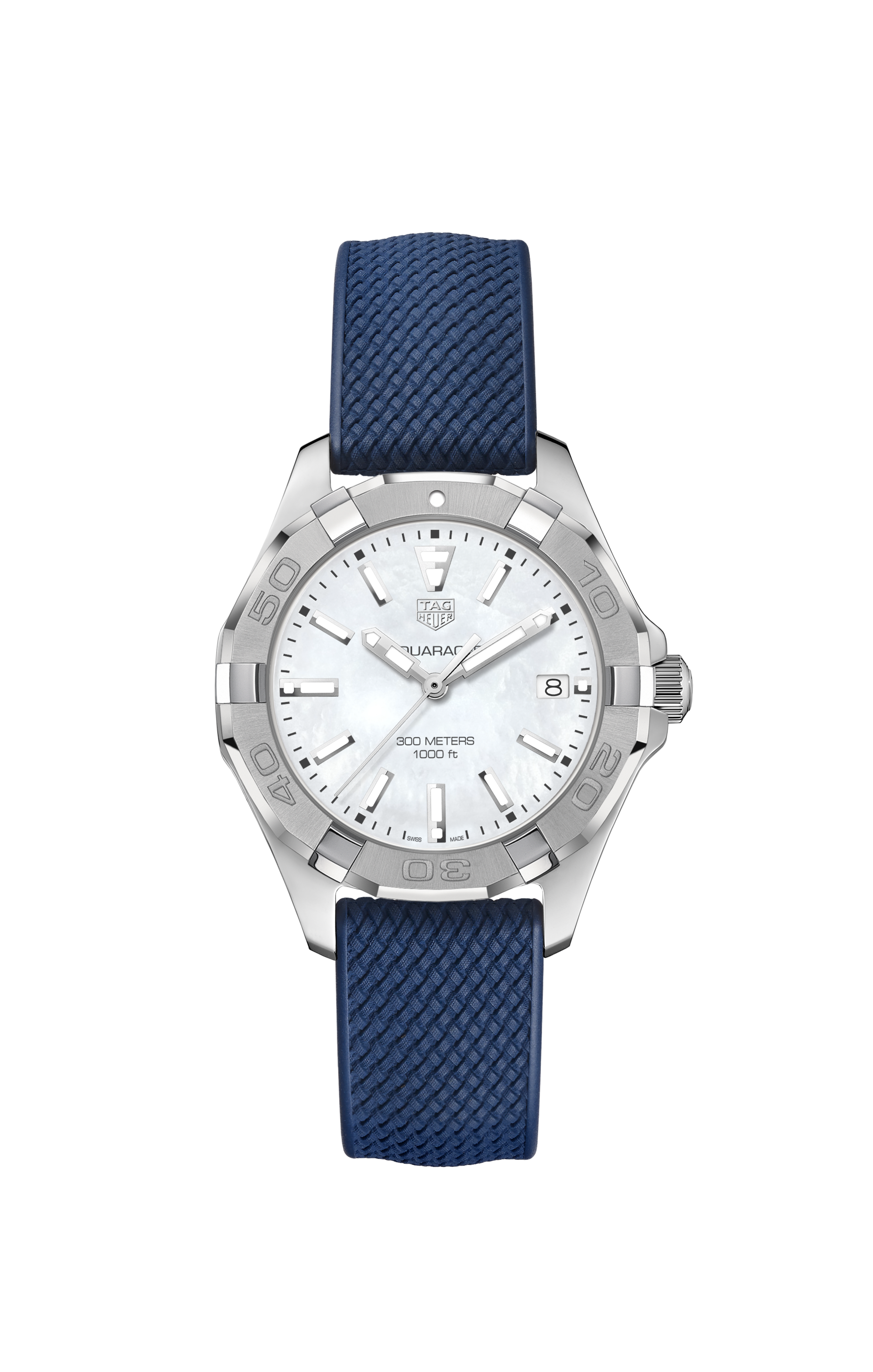 竞潜系列女士腕表的新生代作品,搭载石英机芯,配备精美的蓝色橡胶表带和风格自然的珍珠母白表盘。 典雅的35毫米精钢表壳,采用抛光和精细磨砂工艺处理,呈现迷人光泽。