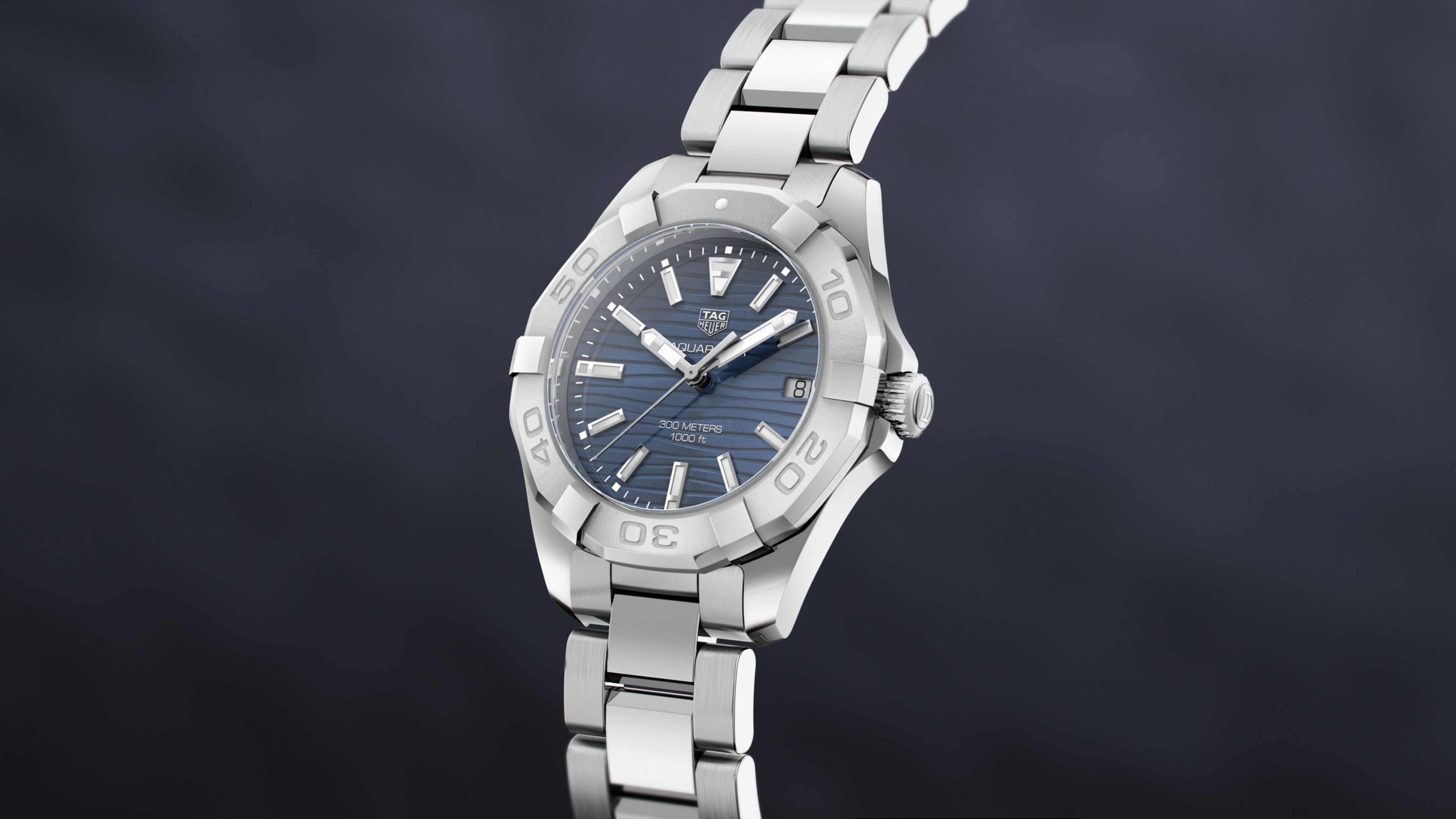 TAG Heuer Aquaracer(竞潜系列)腕表具备专业潜水腕表的诸多特征,非常适合日常佩戴。 其中包括:涂覆Super-LumiNova®荧光材料的时标和指针,精钢表链带双安全按钮和潜水延展装置,以及“易握”旋入式上链表冠。