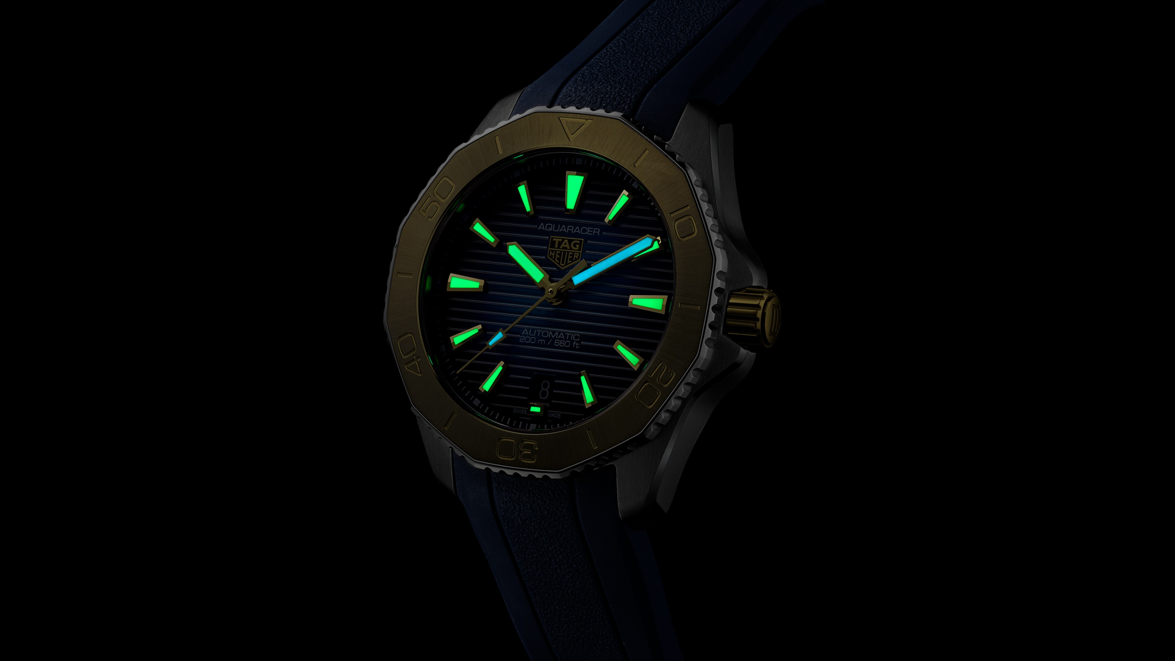 精致的表带由高强度的深蓝色橡胶制成,搭配坚固的精钢表扣和舒适的可延展链节,从容应对任何挑战。
