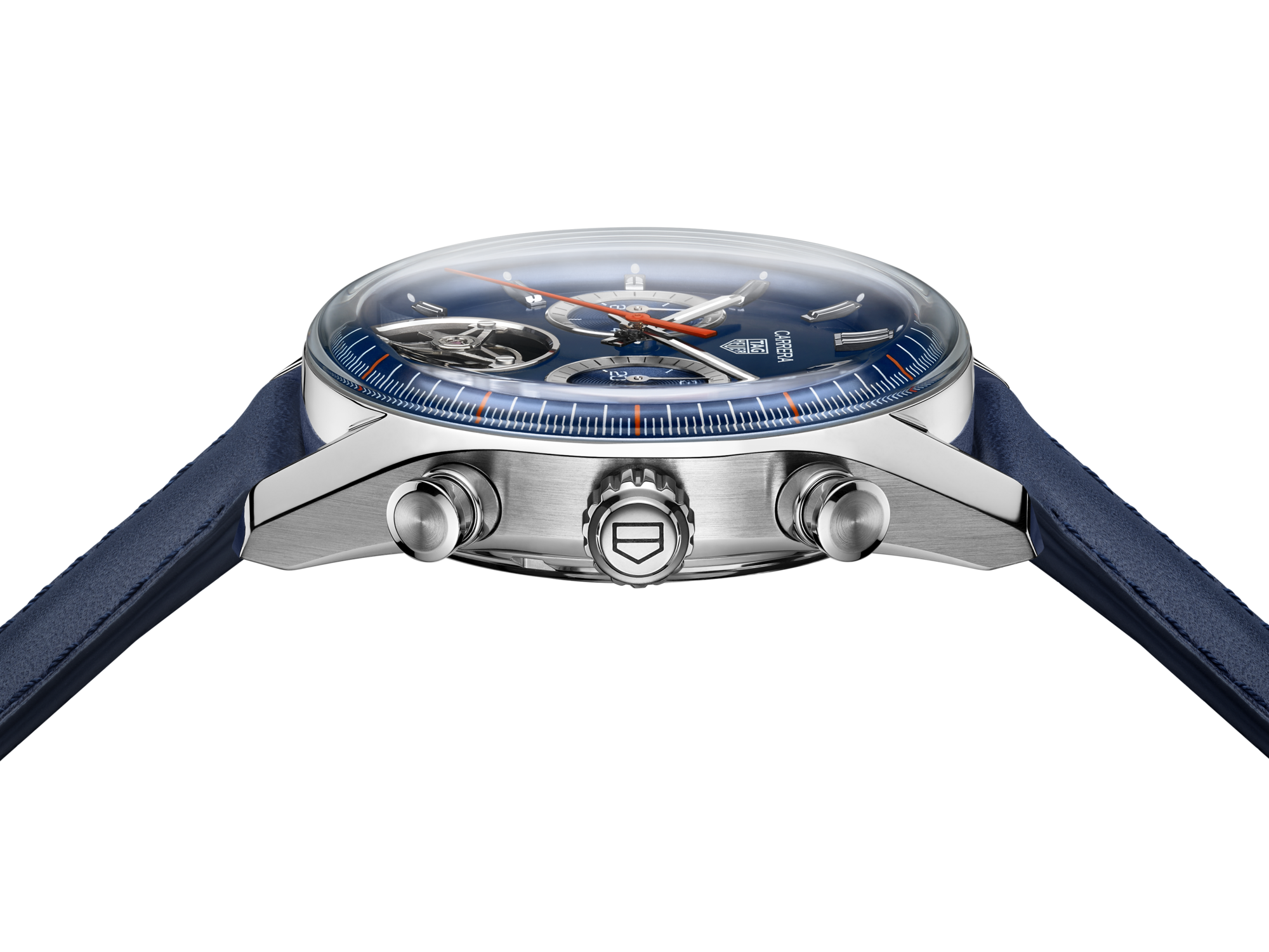 表盘上明亮的橙色秒针与蓝色小牛皮表带形成鲜明对比,果敢无畏,活力动感。