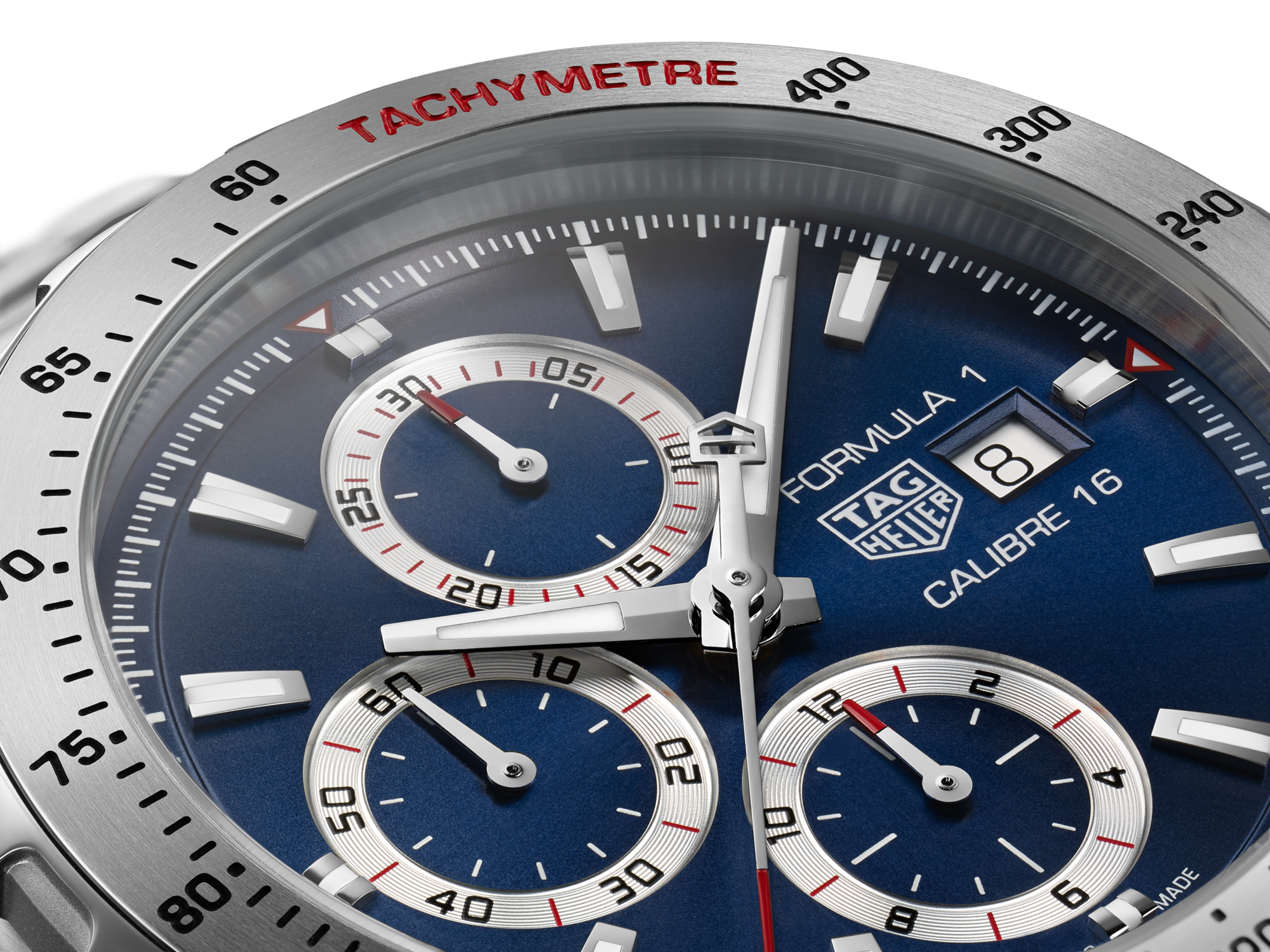 自动机芯, 44 mm, 精钢 CAZ2015.BA087644毫米运动计时码表,配备绚丽的蓝色表盘,蓝色和银色子表盘及磨砂抛光精钢表壳。固定精钢表圈设有测速刻度,可将距离转换为速度。