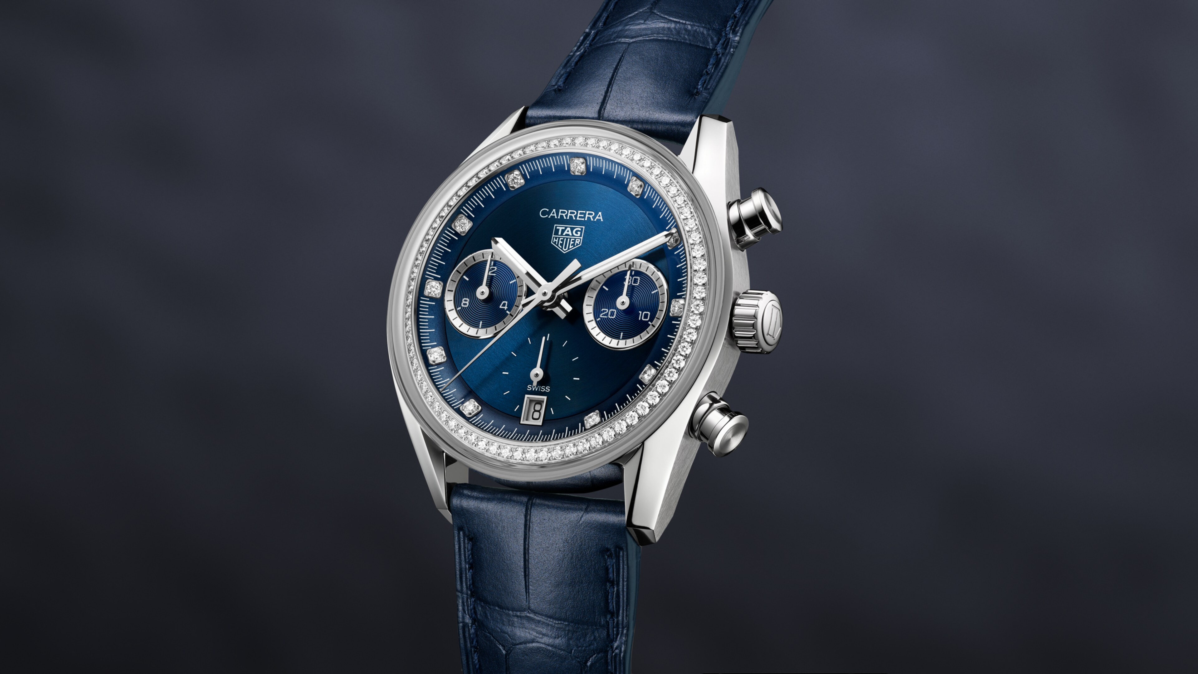 深藍色鱷魚皮錶帶質感迷人,堪比腕錶的創新意念,與精鋼和鑽石的冷冽光芒形成對比。