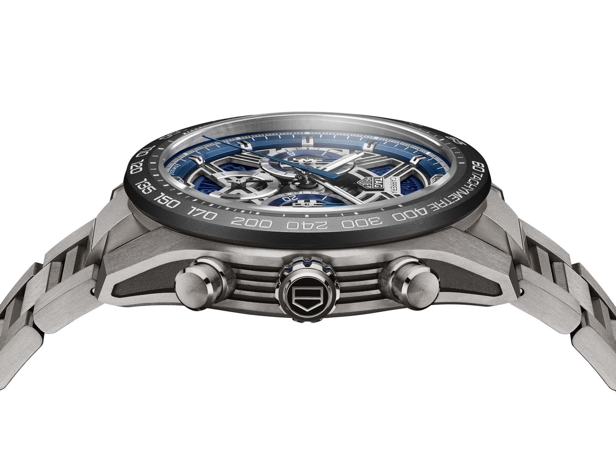 鏤空錶面體現速度與創新的精髓,環繞矚目的藍色外緣,各計時盤均飾有對比藍色細節。鍍銠指針與刻度塗覆白色Super-LumiNova®夜光塗層,確保在高速運動中亦能清晰讀時。6點鐘位置設有日期視窗,使這款為性能而設的腕錶更添實用。