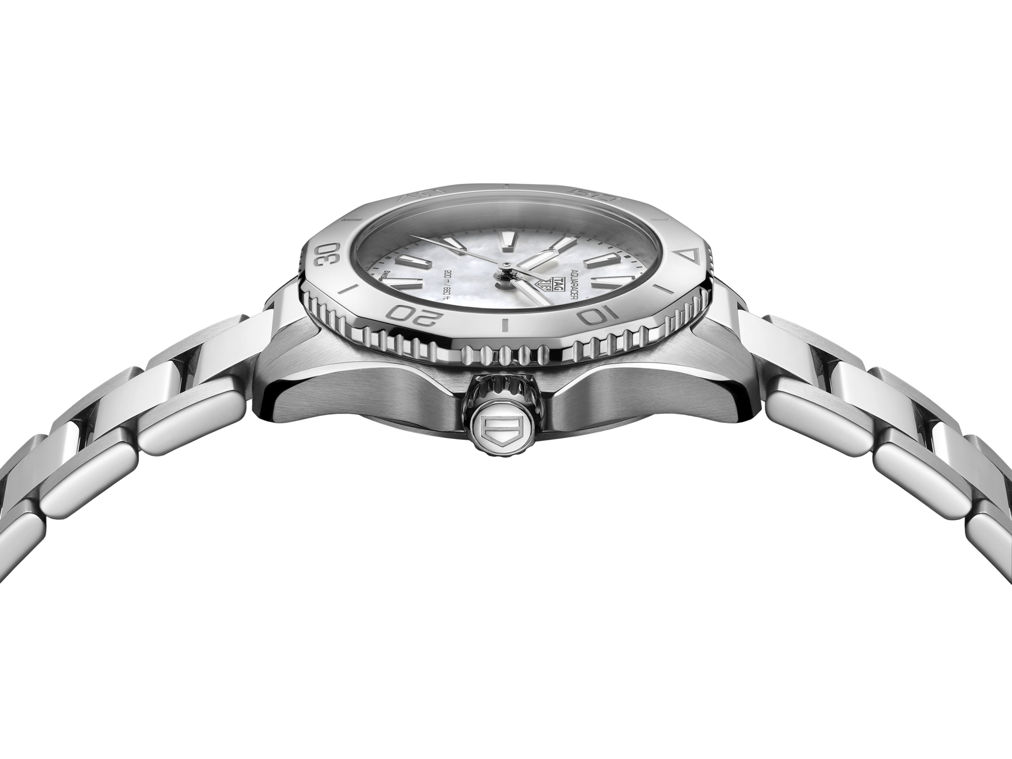 Featuring a delicate white mother-of-pearl dial, this 30mm TAG Heuer Aquaracer strikes the right balance between elegance and technicity. With its ultra-resistant steel case, 60-minute scale bezel and bracelet, this timepiece is eager to go further.