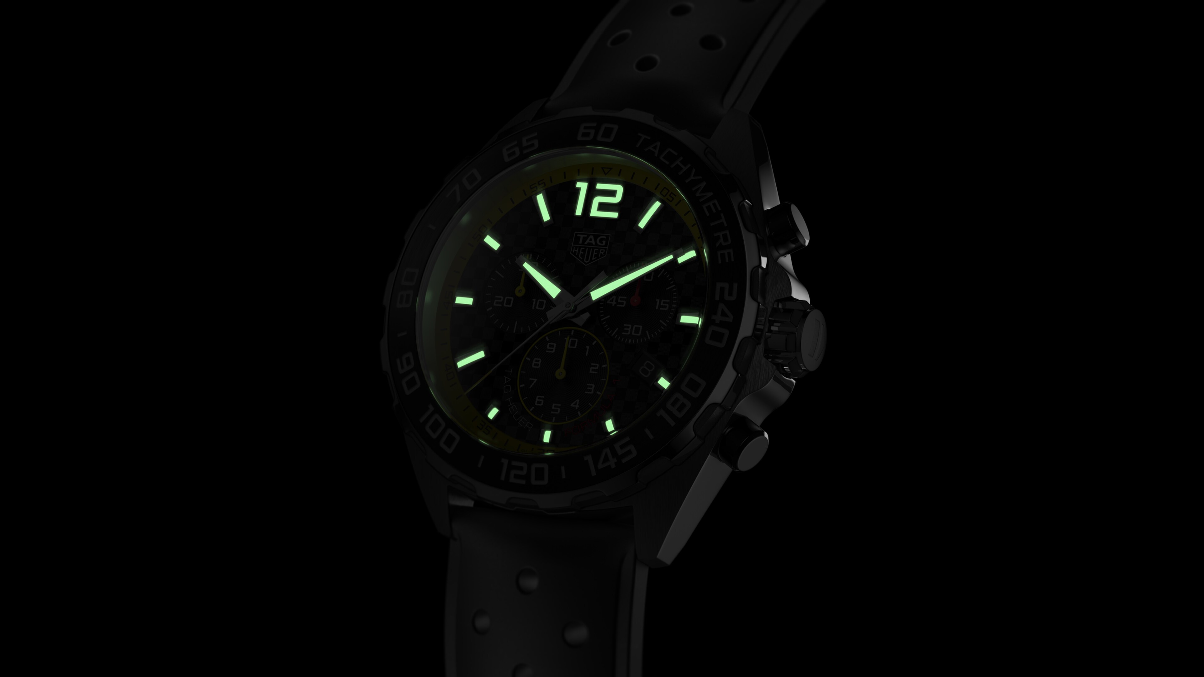 Un reloj que transmite la energía de la Formula 1 en su esfera negra con patrón de fibra de carbono y su correa de caucho negra con hebilla de acero.