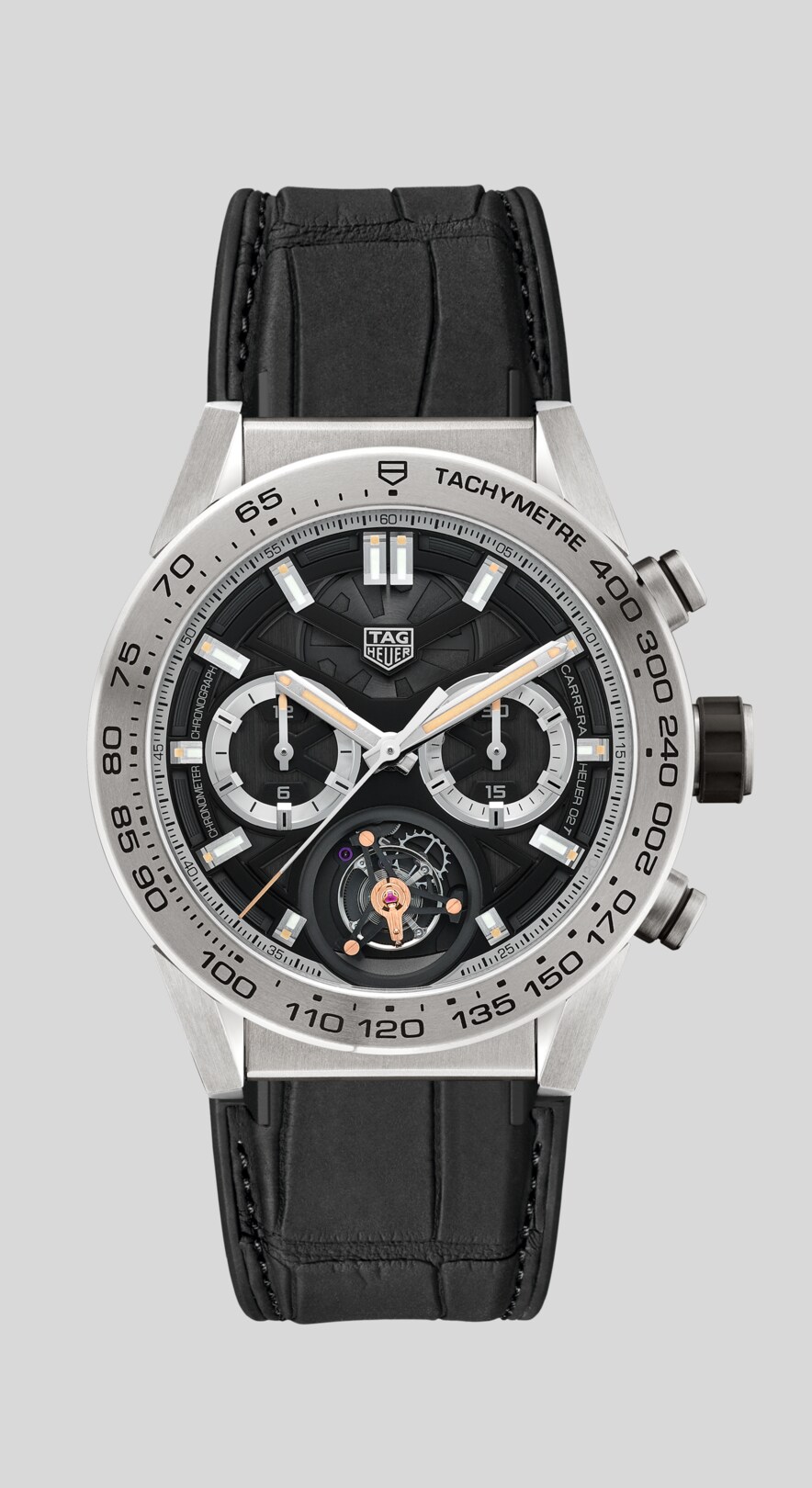 タグ・ホイヤーの60年代のアーカイブピースから着想を得た、上品でヴィンテージの時計のような風合いのあるデザインです。フルブラックPVDのオープンワークダイヤルに2つのサブカウンターを配し、視認性に優れています。また6時位置にトゥールビヨンが映え、見る人を魅了します。ストラップは上質なブラックアリゲータストラップを採用し、ビジネスシーンでもお楽しみいただます。また、付属のグレーとブラックのシックなカモフラージュ柄のストラップはファッションのワンポイントとしてもお楽しみいただけます。