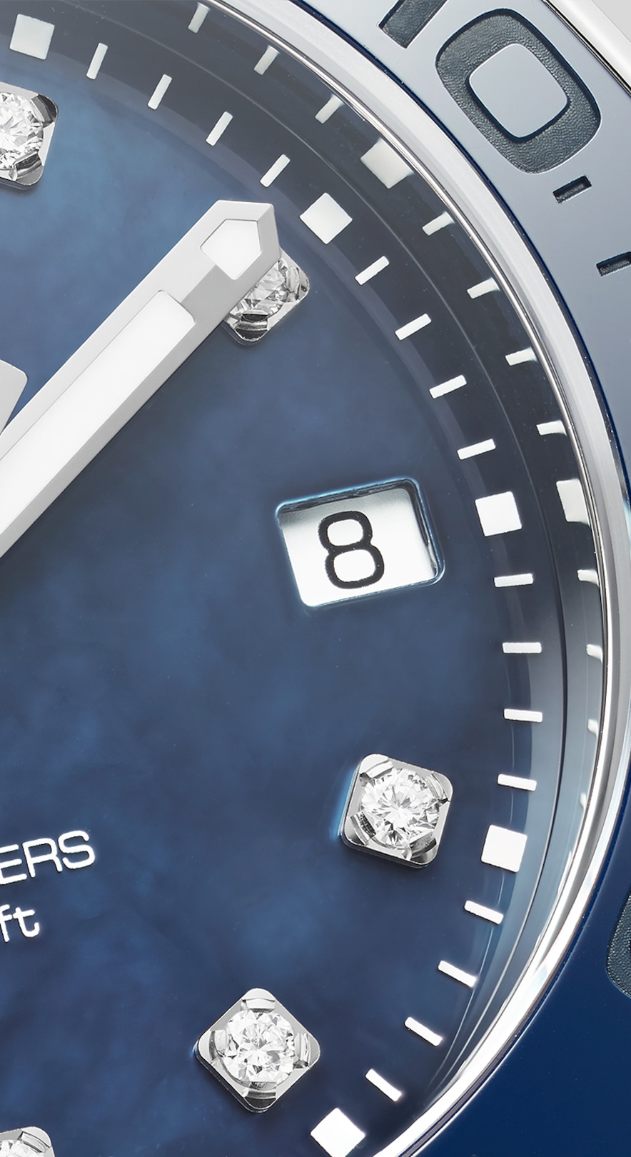Quartz, 35 mm, Steel WAY131L.BA0748Glittering diamonds (0.1 CT) on a blue mother-of-pearl dial. A bezel of polished blue ceramic harder than steel. Featuring a steel folding clasp with double safety push-buttons and diver extension.
