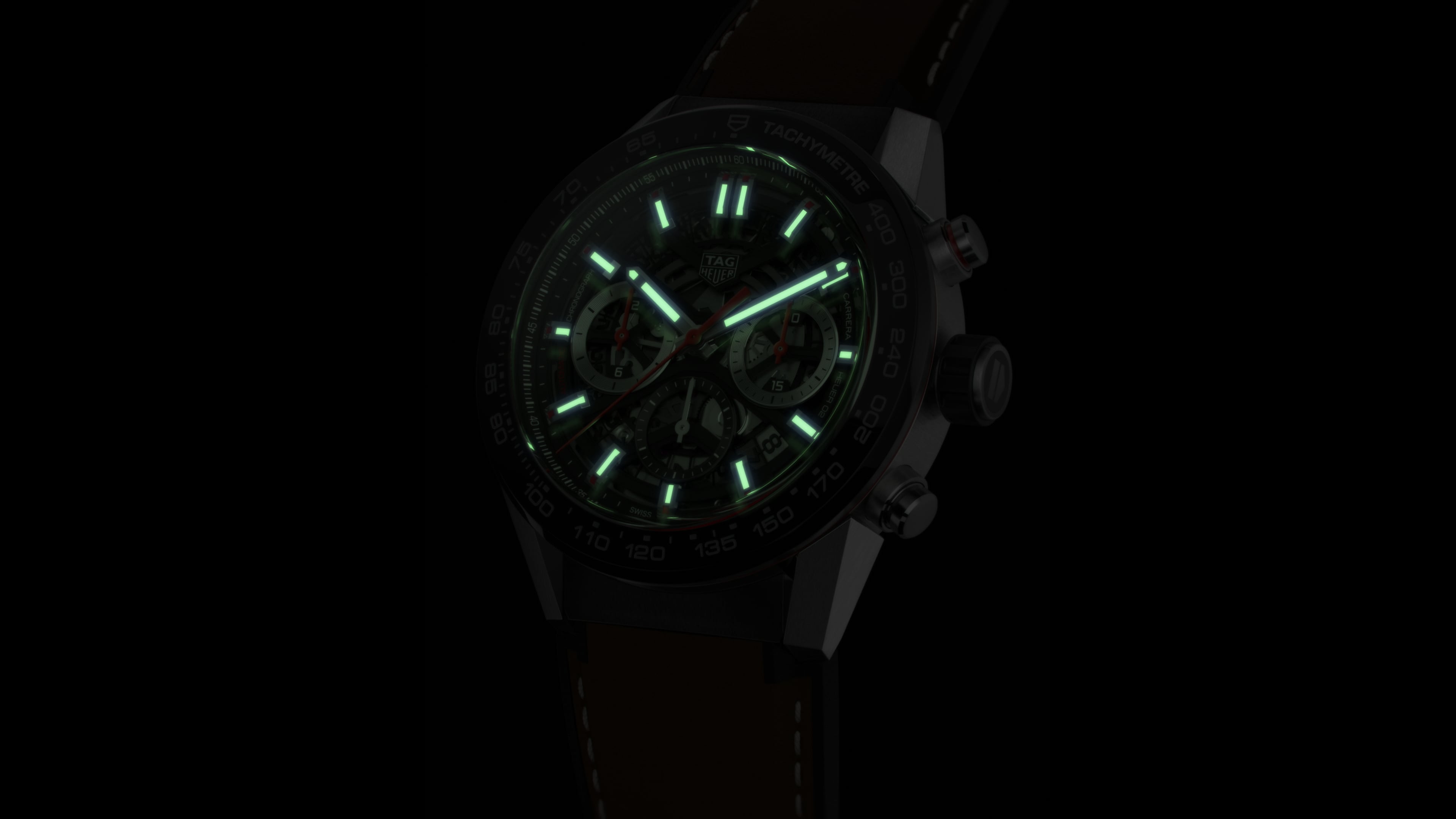 This TAG Heuer Carrera features the original chronograph counters at 3, 6 and 9 o’clock. The skeleton dial is protected by a curved sapphire crystal water resistant to 100 meters. The power reserve is 80 hours.