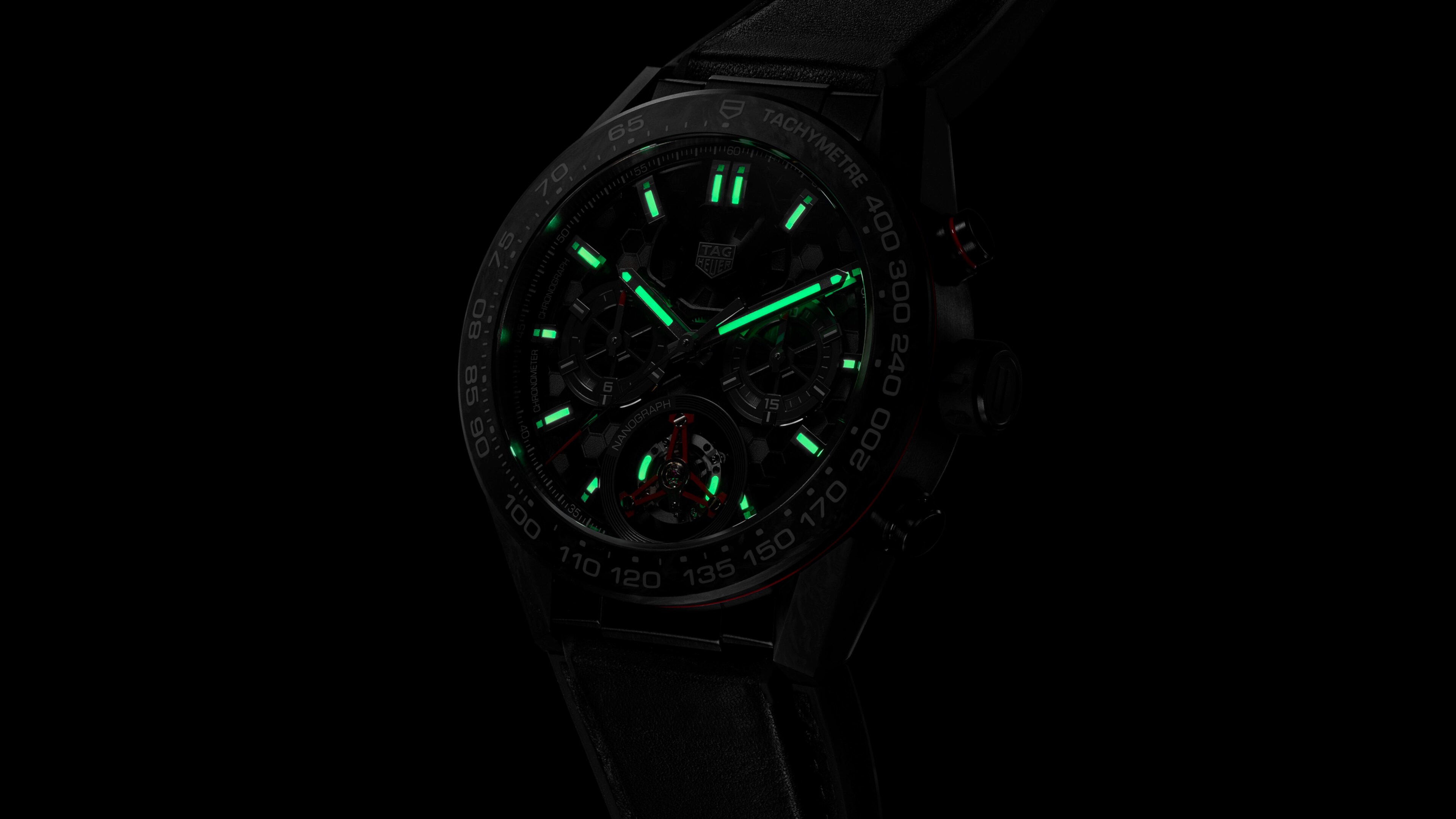 At the heart of the watch: the Calibre HeuerO2T COSC Nanograph, with its red-accented tourbillon made using an accurate carbon composite hairspring.
