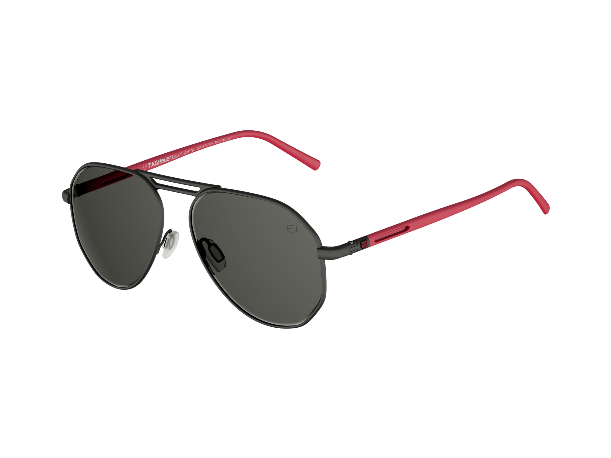 Der Rand ist aus galvanisiertem Edelstahl in mattschwarzem Ruthenium-Finish gefertigt, um einen eleganten, technischen Look zu erzielen. Ein hoher, doppelter Steg sorgt für ein leichtes Tragegefühl und verleiht dem Gestell zugleich eine charakteristische Identität. Die verstellbaren, mit Kautschuk überzogenen Nasenpads gewährleisten eine sichere, individuelle Passform und Tragekomfort. Die mit hellrotem Kautschuk überzogenen Bügel aus Metalldraht sind flexibel und verleihen dem Modell einen minimalistischen Farbakzent. Abgerundet wird das Gestell von einem lackierten TAG Heuer 3D-Logo – einer eleganten, subtilen Signatur.