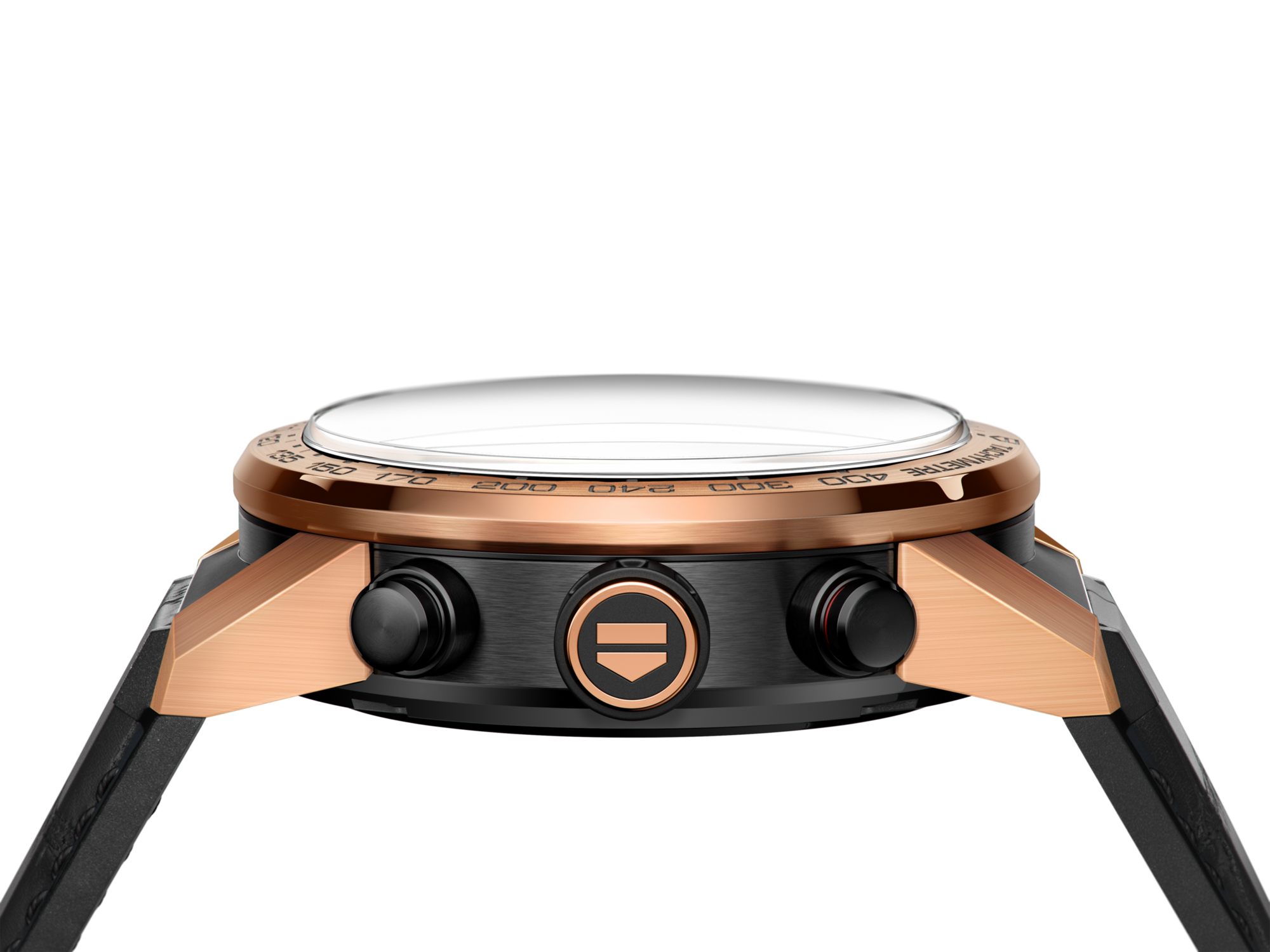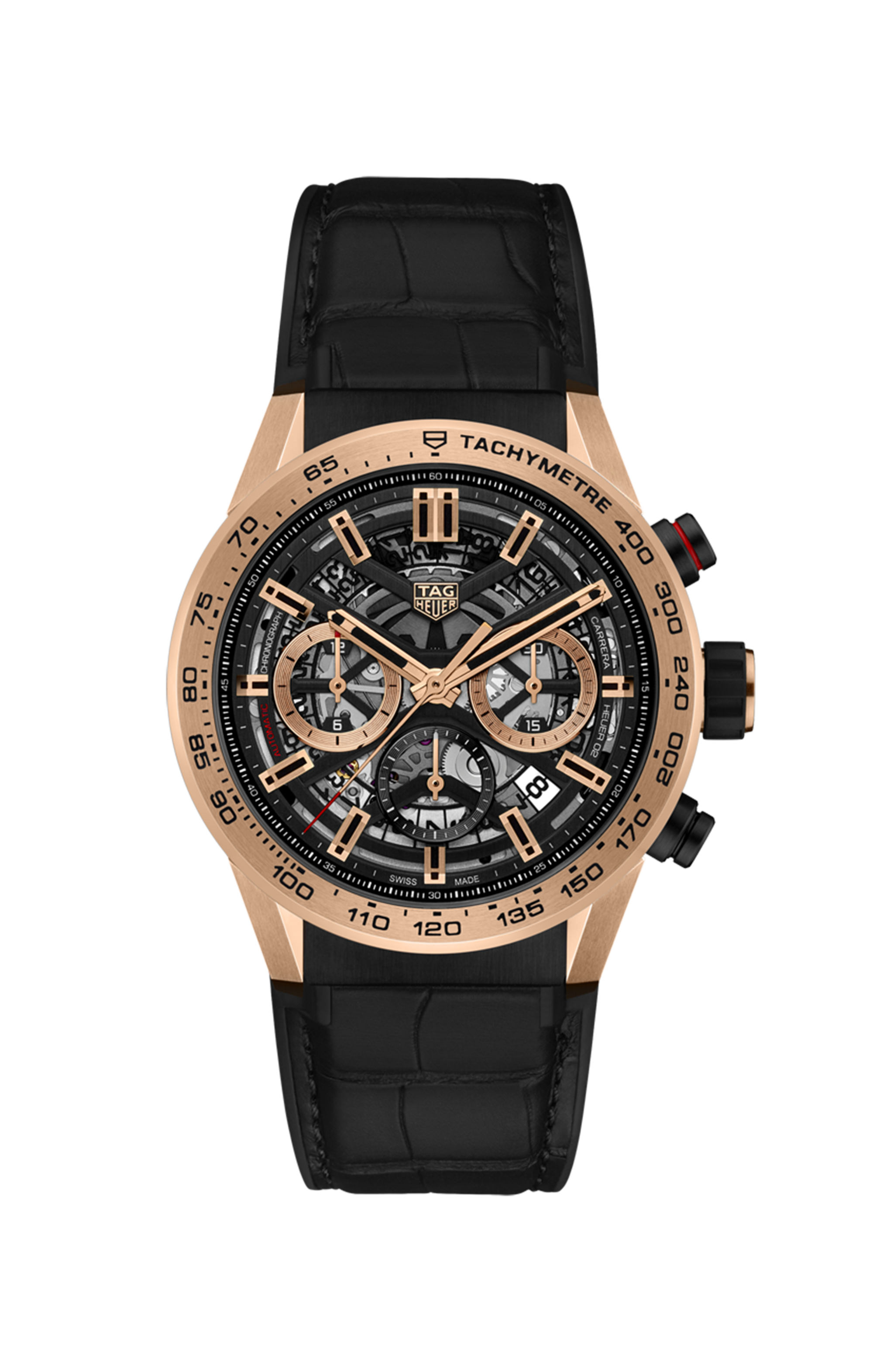 Das schwarze Gehäuse und das skelettierte Zifferblatt werden durch das leuchtende Gold aufgehellt. Im Inneren findet sich das Automatik-Manufakturwerk Heuer 02 mit einer Gangreserve von 80 Stunden.