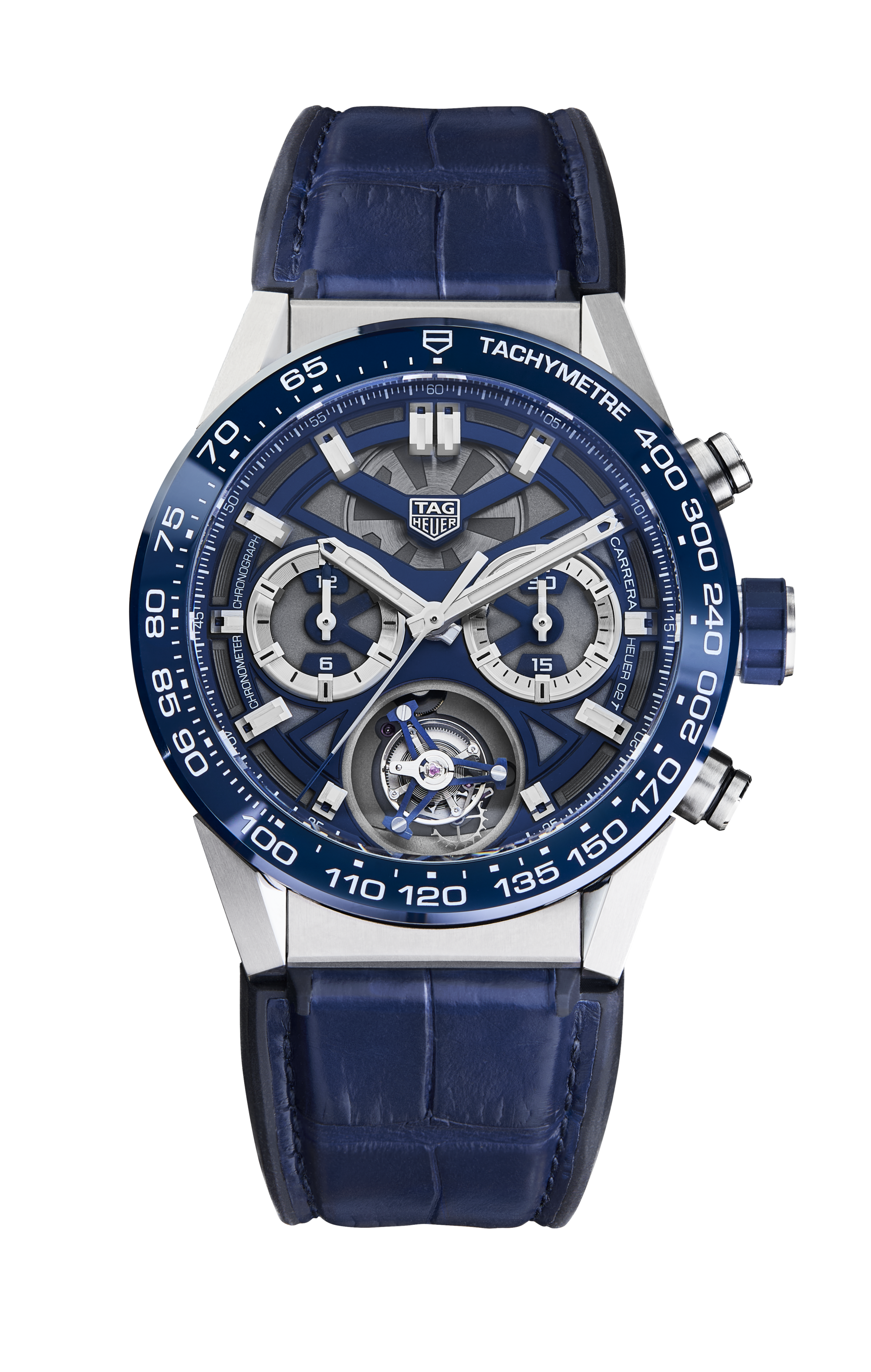 Striking blue finishing is applied to the column wheel, the dial and tourbillon bridge of this Calibre H02T.