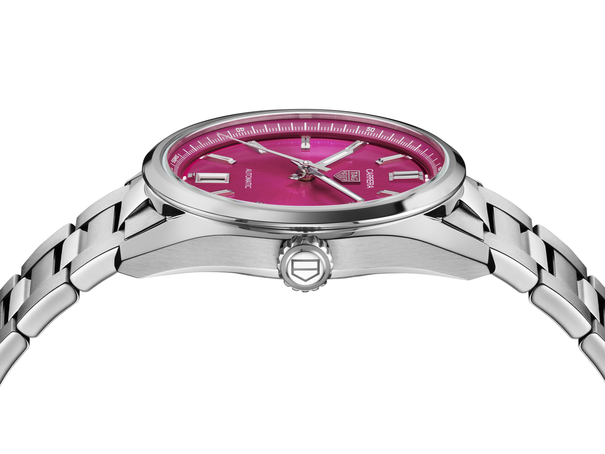 The hands applied with white Super-LumiNova® contrast superbly against the vivid pink dial and its gradient ring along the flange.