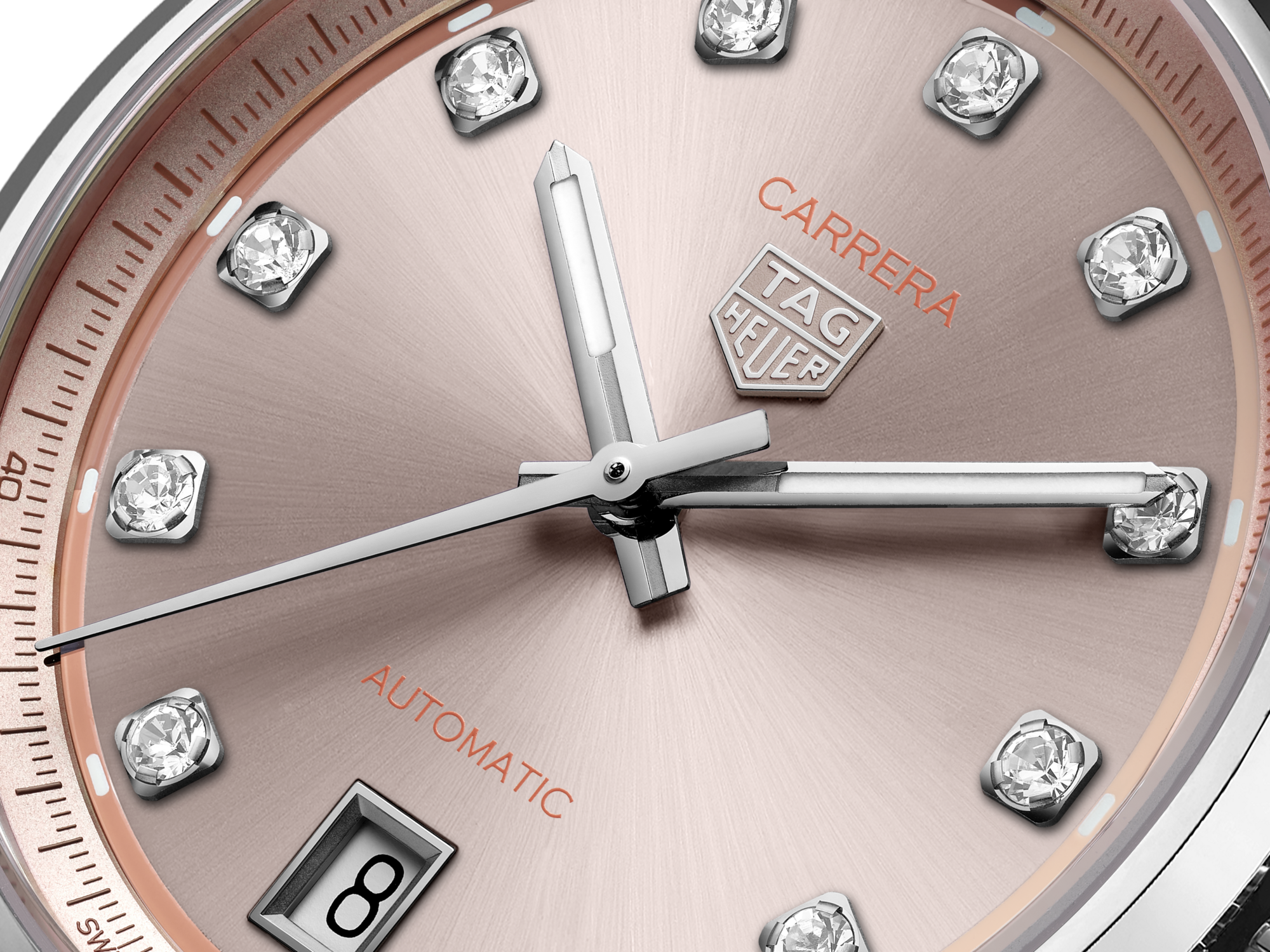 The powdery pink sunray-brushed dial creates a feminine and sophisticated look, accented by a gradient track circling the dial. Diamond-set indexes add a touch of luxury, embodying the spirit of the TAG Heuer Carrera.