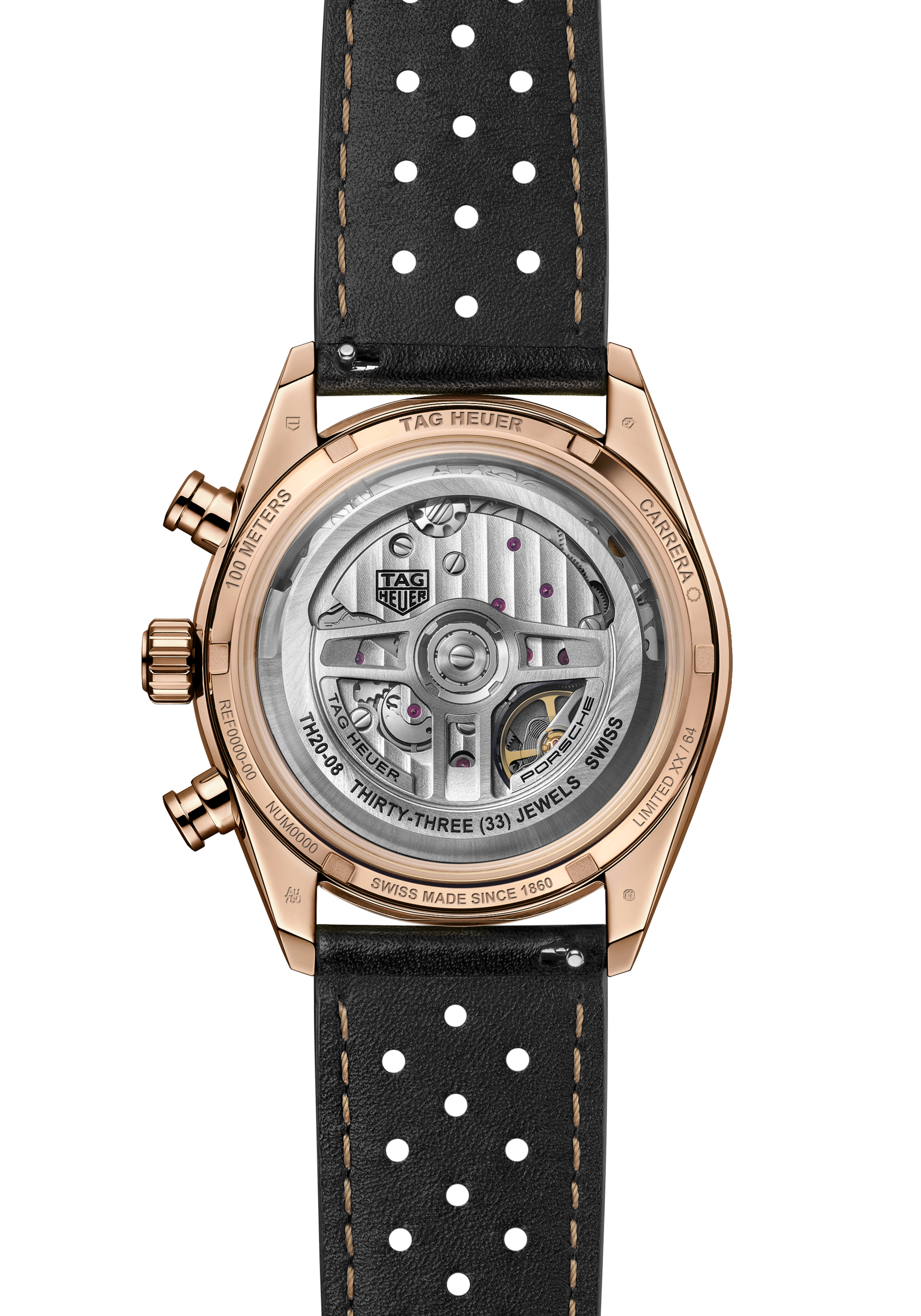 The 42 mm case, crown, and pushers are crafted in fine-brushed and polished 18K 5N solid rose gold—a nod to the golden Porsche lettering of the first 911 models. Beneath the domed sapphire crystal lies the in-house Calibre TH20-08, a groundbreaking chronograph movement with a Chronosprint complication, an 80-hour power reserve, and a custom Porsche steering wheel rotor. The caseback bears the engraving “LIMITED XX/64” alongside the Victory Wreath, echoing Jack Heuer’s tradition of gifting Carreras to victorious drivers.