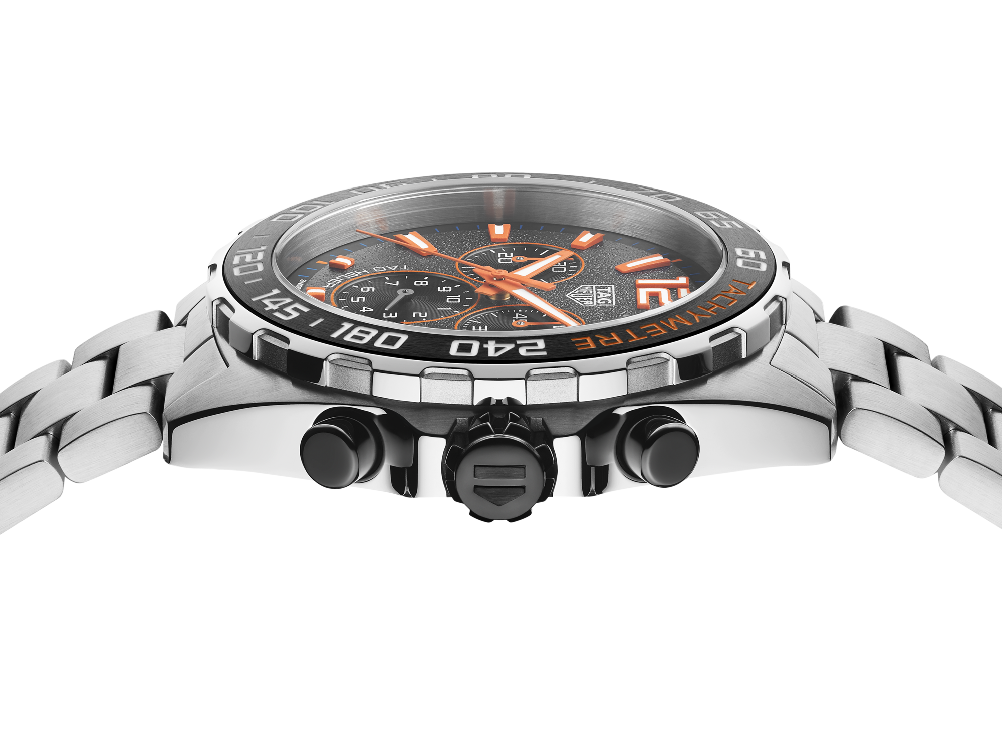 A fast-paced and sporty chronograph is secured by a steel folding clasp with double safety system and driver extension to wear over a racing suit.