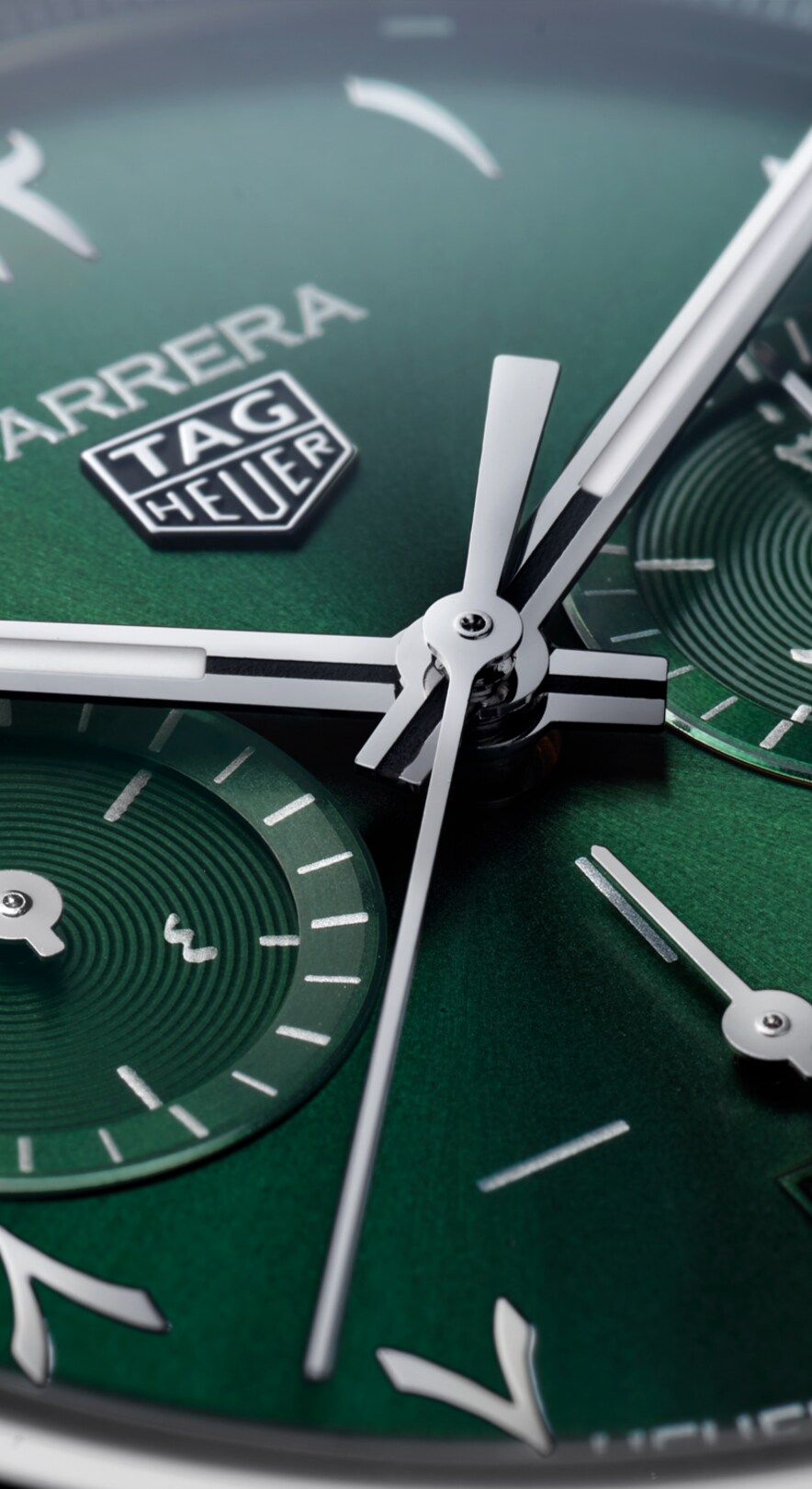 The vibrant green dial proudly stands out, expressive and confident. The Indian numerals and chronograph counters are resolutely chic.