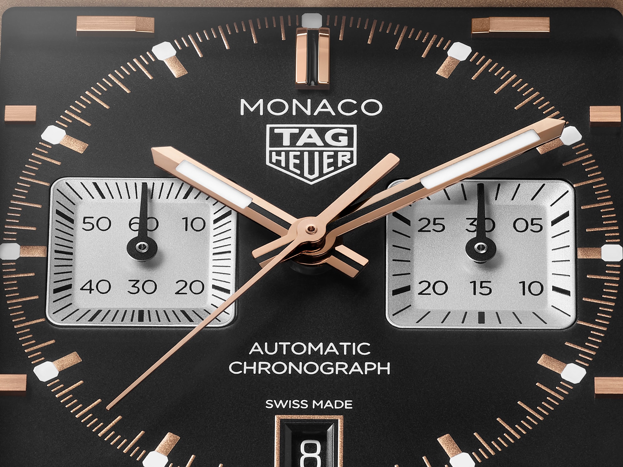 The black opaline dial features silver subdials and 18K 5N rose gold-plated indexes and hands, complemented by white Super-LumiNova® for flawless readability. The angled date at 6 o’clock adds balance to the dial, while subtle golden accents enhance the TAG Heuer Monaco’s signature square geometry.