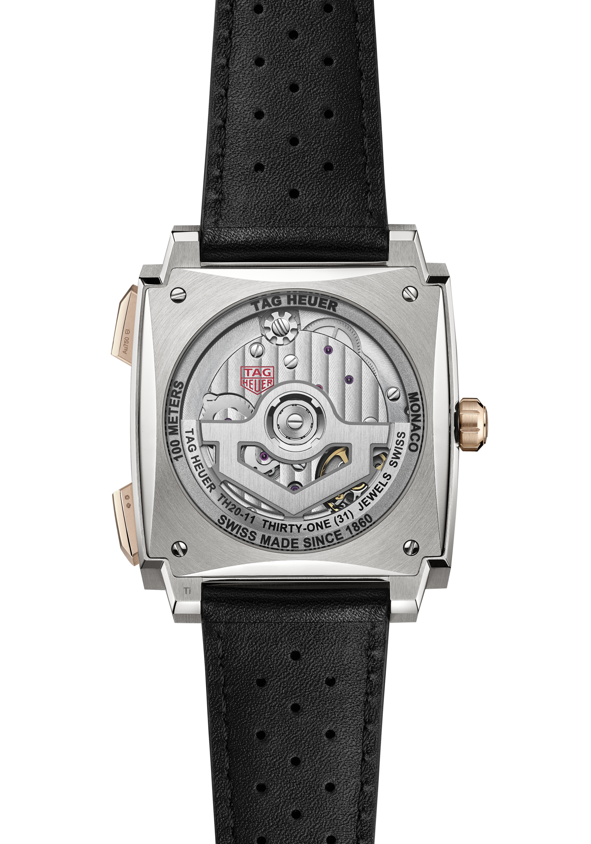 The black perforated calfskin leather strap, a tribute to the 1969 Heuer Monaco original, combines vintage inspiration with modern comfort. Secured by a grade 5 titanium folding clasp with double safety push-buttons, it completes a timepiece that unites elegance, innovation, and the enduring TAG Heuer Monaco spirit.