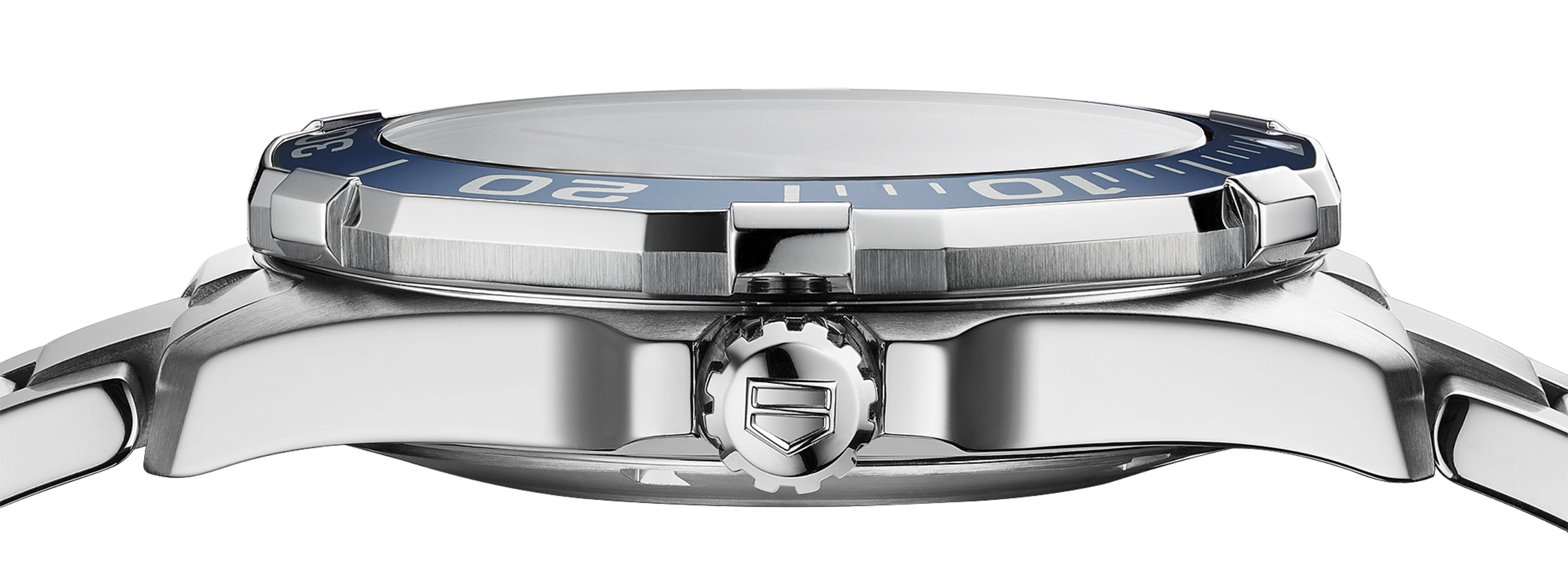 Quartz, 41 mm, Steel WAY111C.BA0928A sophisticated quartz watch with large luminescent indexes on its blue dial and oversized arabic numerals on its unidirectional turning bezel. The bezel is in steel and aluminum. The 41mm brushed and polished steel case is fitted with six studs to facilitate handling with diving gloves.