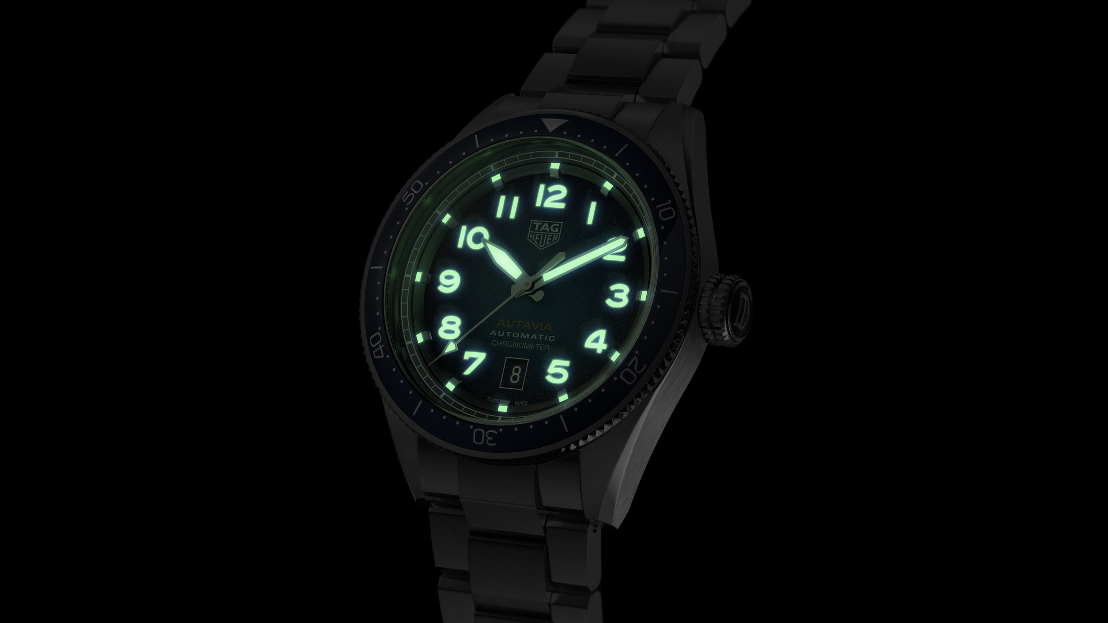 A curved double anti-reflective sapphire crystal further emphasize the Autavia’s at-a-glance readability. Vintage-inspired white Super-LumiNova® lume fills the polished hands and markers.