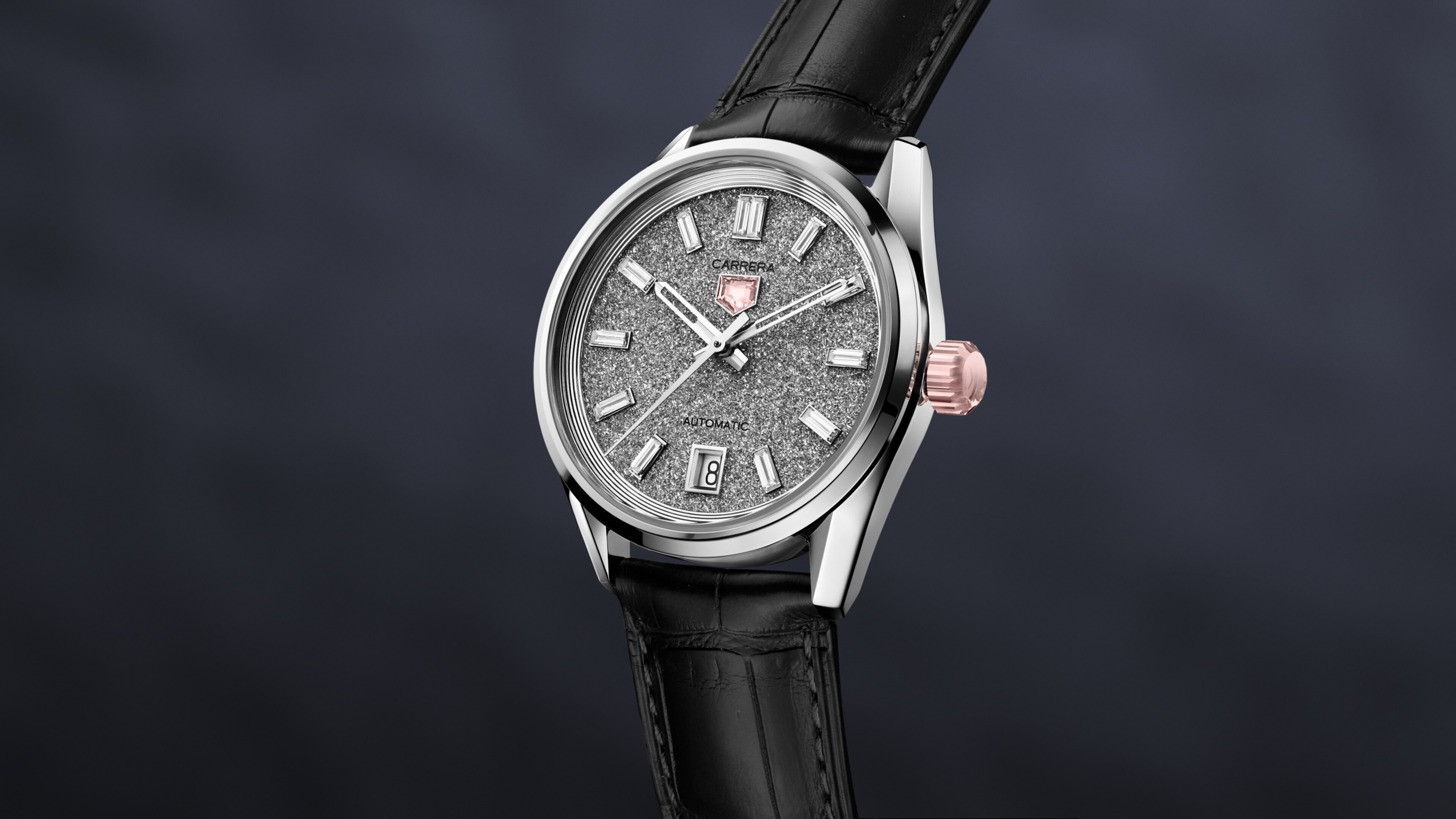 La esfera de diamantes policristalinos (2,9 quilates) brilla con luz propia, rodeada por 12 diamantes cultivados en laboratorio talla baguette (0,5 quilates) a modo de índices. Un diamante rosa de 1,3 quilates corona el reloj, complementado por un escudo TAG Heuer de diamante rosa (0,1 quilates).