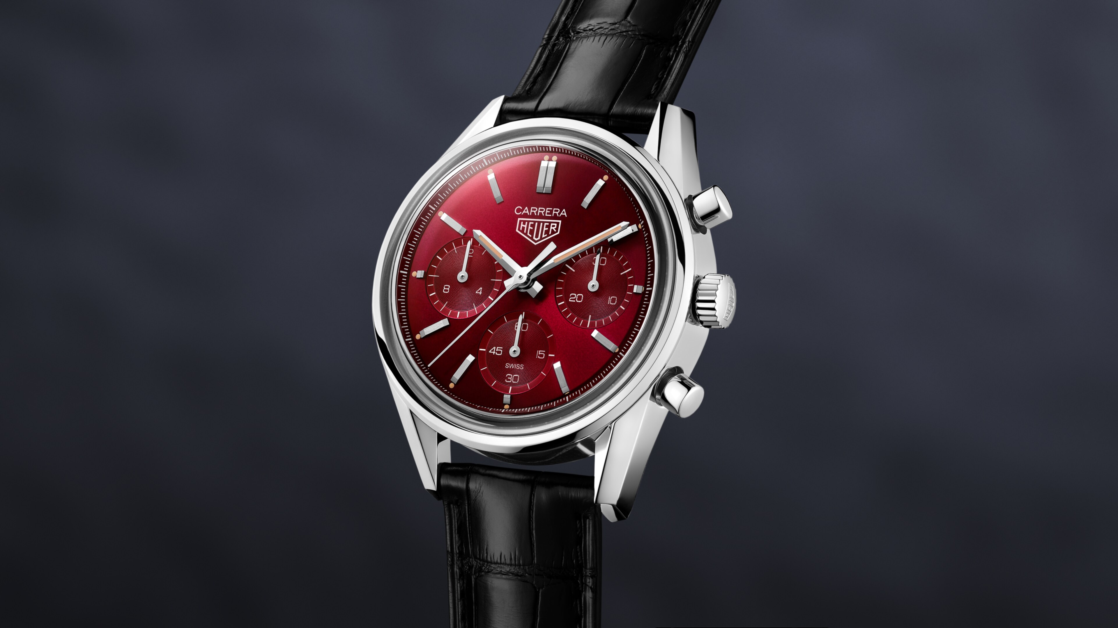 The bright red dial makes for a dramatic statement and features the printed Carrera name and Heuer crest, a tribute to a signature design.