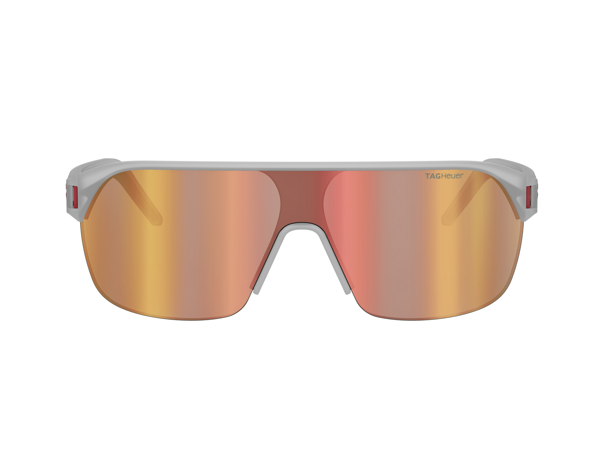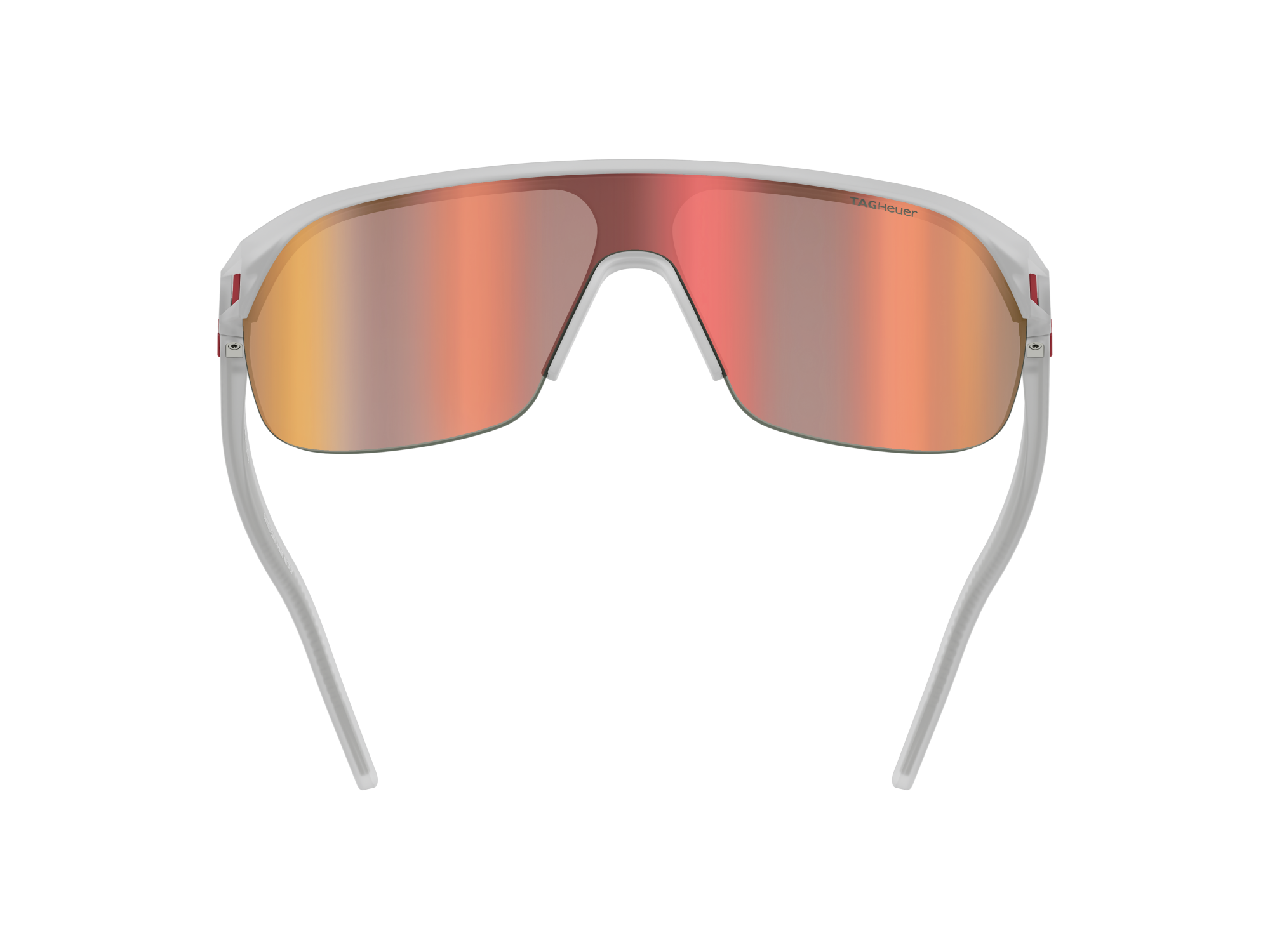 The TAG Heuer Drive Bio-Nylon sunglasses combine modern sophistication with sport-inspired functionality. Featuring a semi-matte transparent light grey frame and striking Heatwave mirrored lenses, they deliver a contemporary expression of the Drive collection’s bold design language.