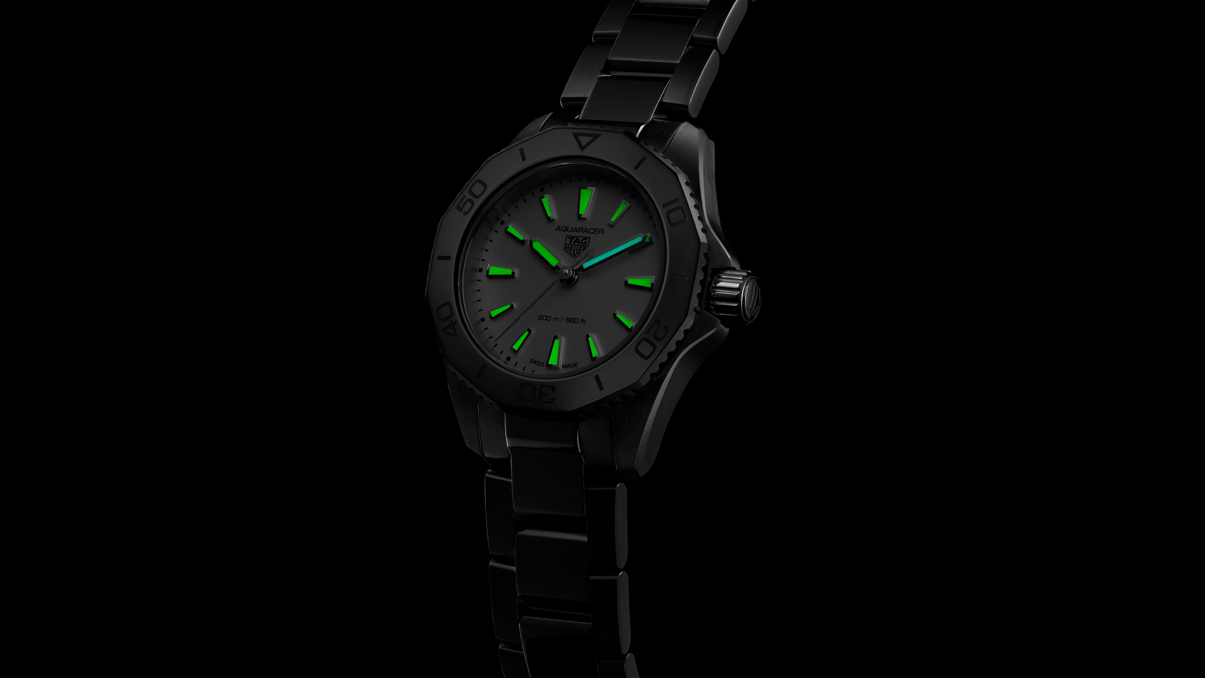 Présentant des finitions élégantes, le boîtier en acier inoxydable de 30 mm de cette TAG Heuer Aquaracer offre une ergonomie optimisée et une étanchéité à 200 m.