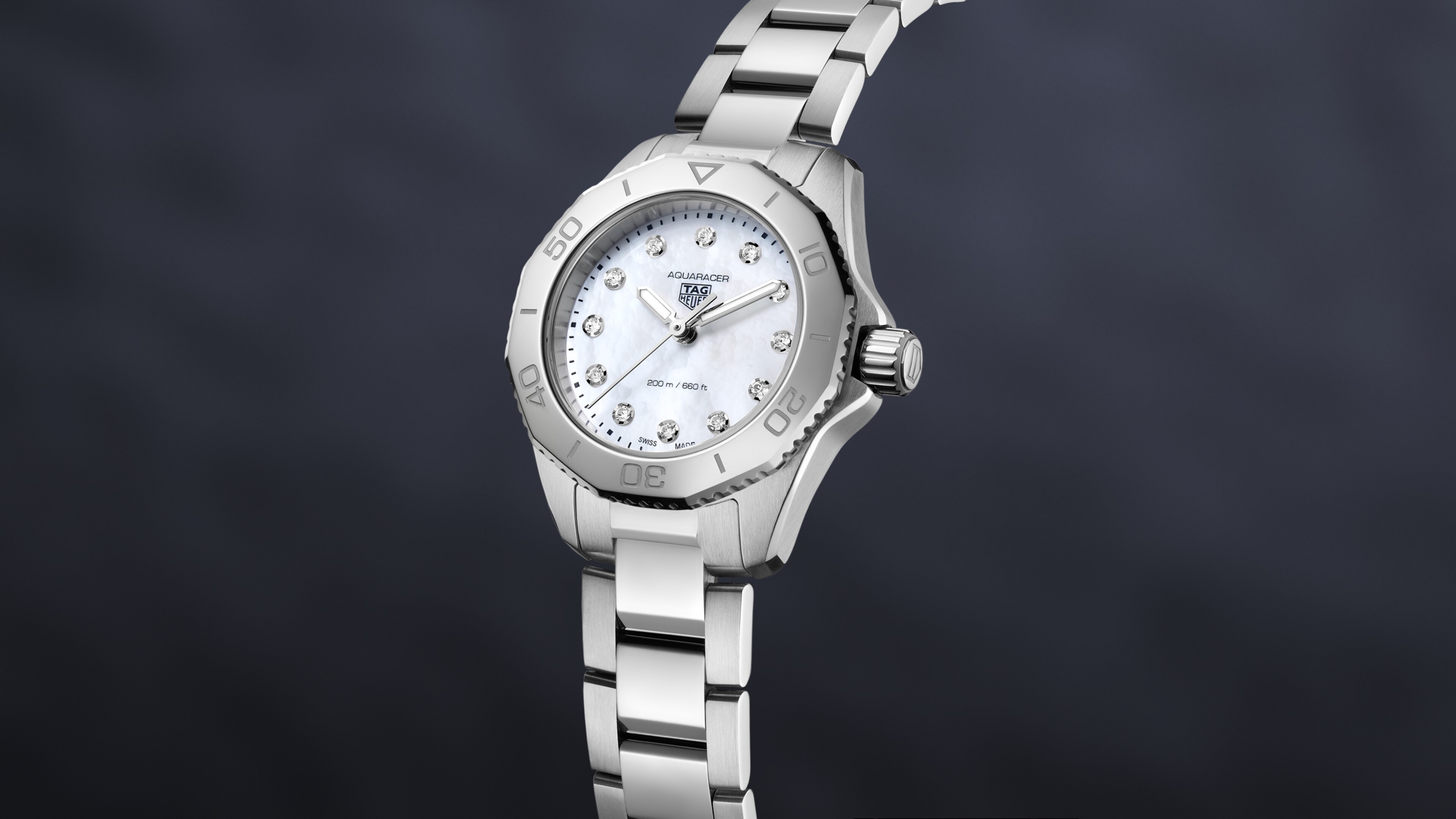 石英, 30 mm, 精钢 WBP1416.BA0622这款TAG Heuer Aquaracer(竞潜系列)腕表是为风格多变的每一天增光添彩的腕间伙伴。这款30毫米腕表饰有钻石时标,表盘则由珍珠母贝打造。为超越极限的理想激励。