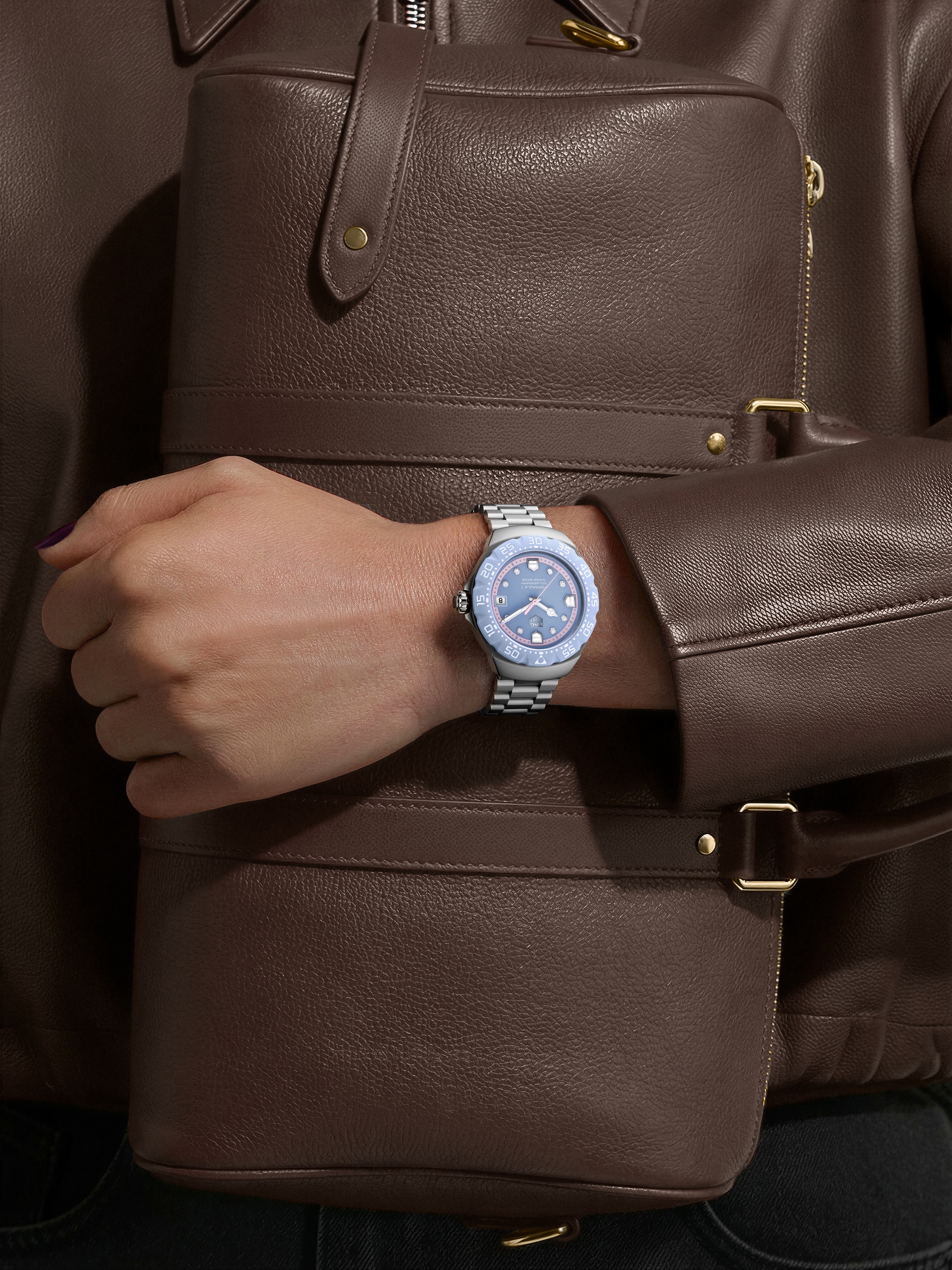 这款泰格豪雅F1系列Solargraph太阳能腕表限量版将大胆设计与精致细节巧妙融合。38毫米喷砂精钢表壳与表链兼具耐用性和日常佩戴舒适度。淡蓝色表盘上饰有8颗圆形镶钻时标(0.076克拉,H色,SI级净度)和盾形刻度,令腕表更显璀璨,读时也更为清晰。采用TH-Polylight打造的双向旋转表圈进一步彰显了该系列对实用设计的执着追求。腕表搭载TH50-00 Solargraph太阳能机芯,能够将光能转化为动能,确保走时精准无误,动力持久充沛,且几乎无需特别维护。