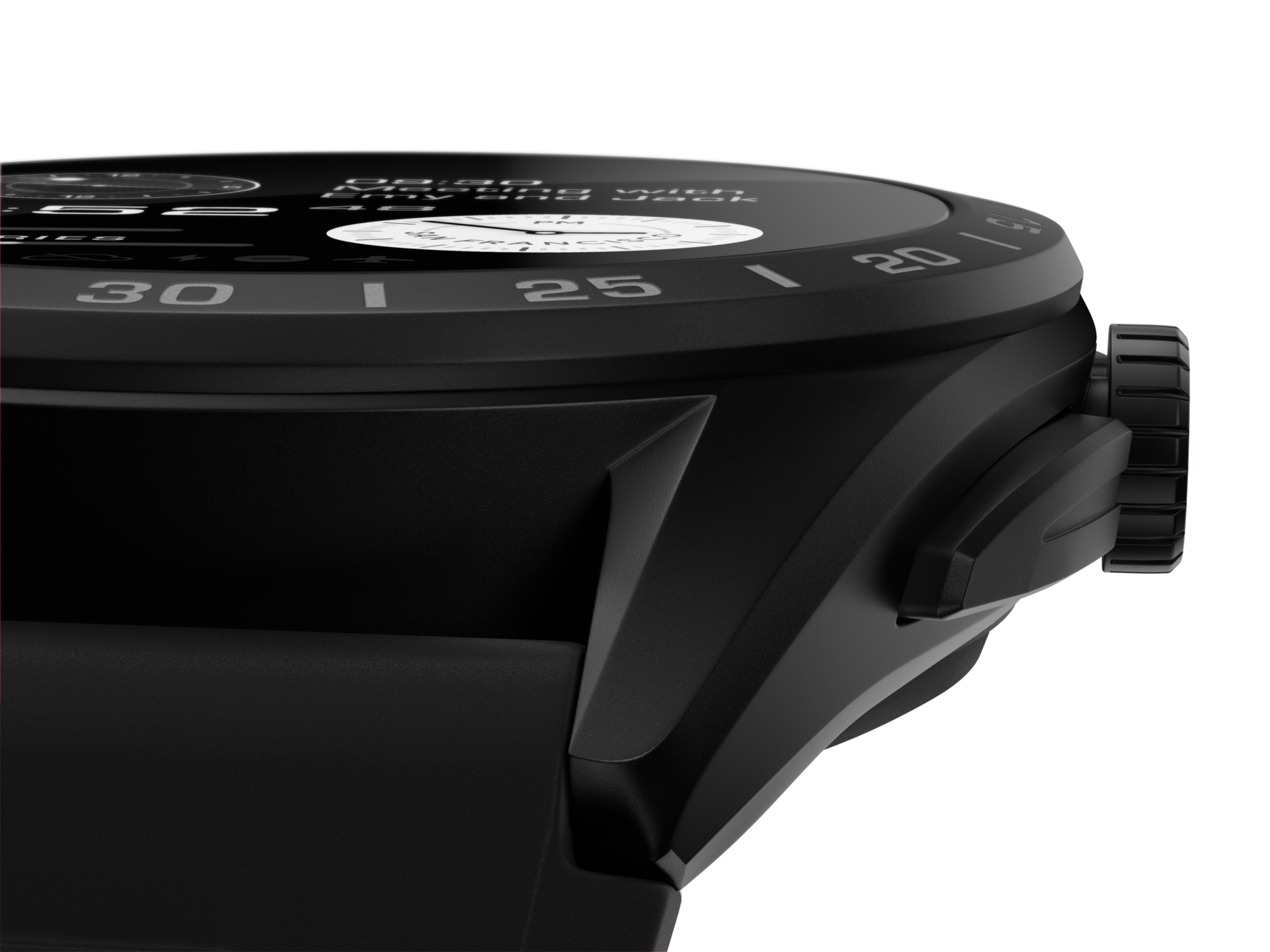 As advanced as ever, the smartwatch's black titanium case matches the black sandblasted ceramic bezel. Two superior, highly-resistant materials.