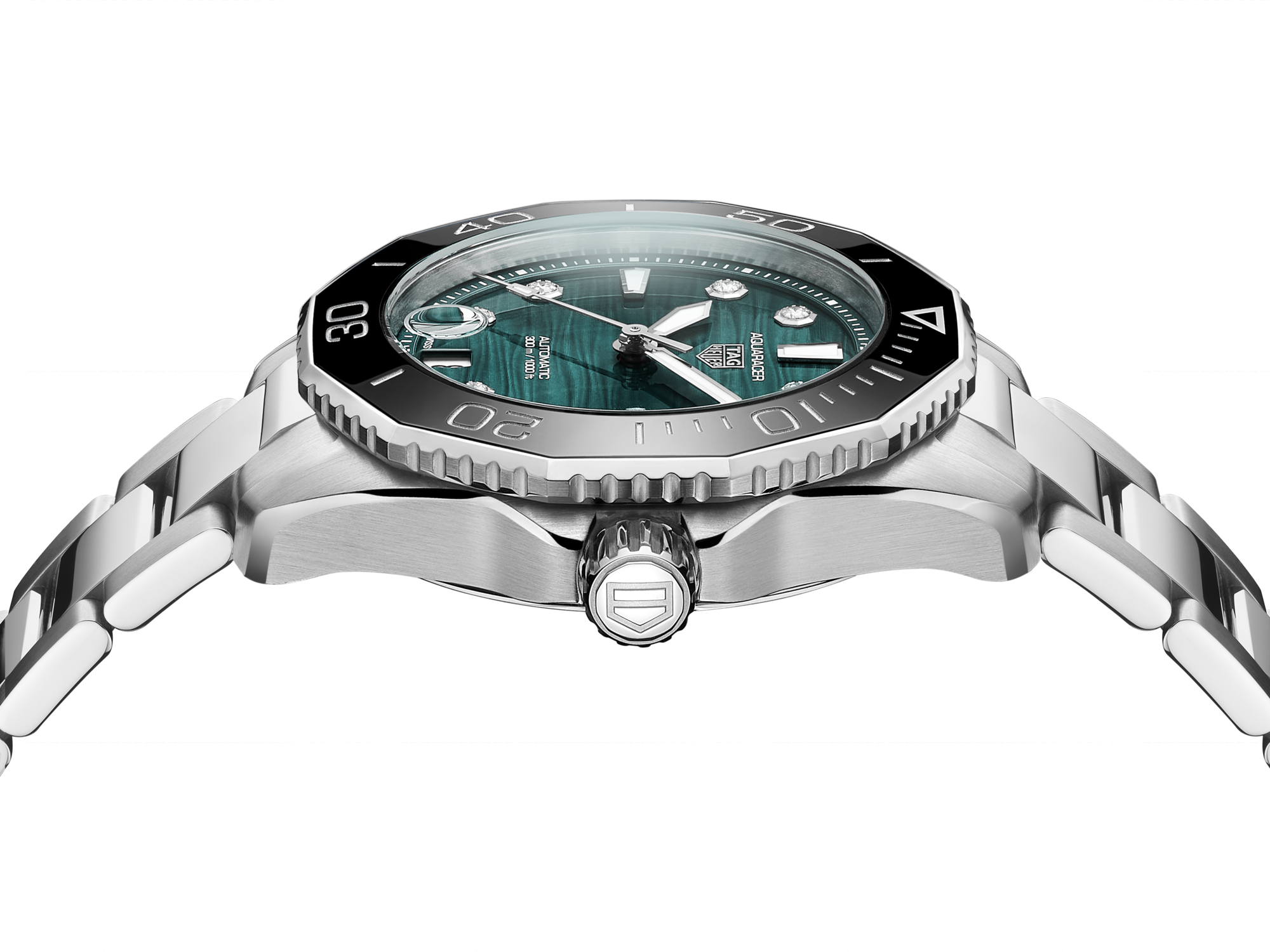 The TAG Heuer Aquaracer seamlessly merges a pressure-proof, finely-brushed, and polished stainless steel 36 mm case with a black ceramic bezel, ensuring its water resistance up to 300 metres.