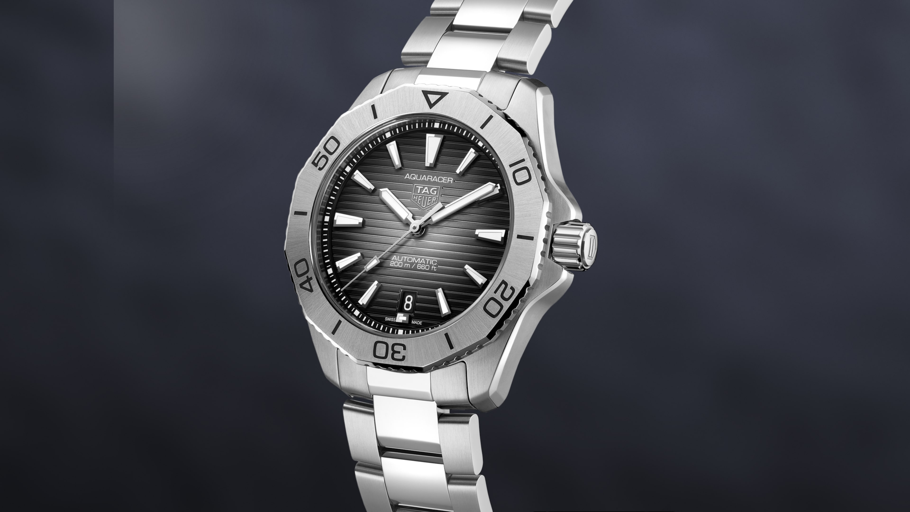 The dial of this TAG Heuer Aquaracer is a black sunray, with a slightly smokey finish that adds drama to an already exceptional design.