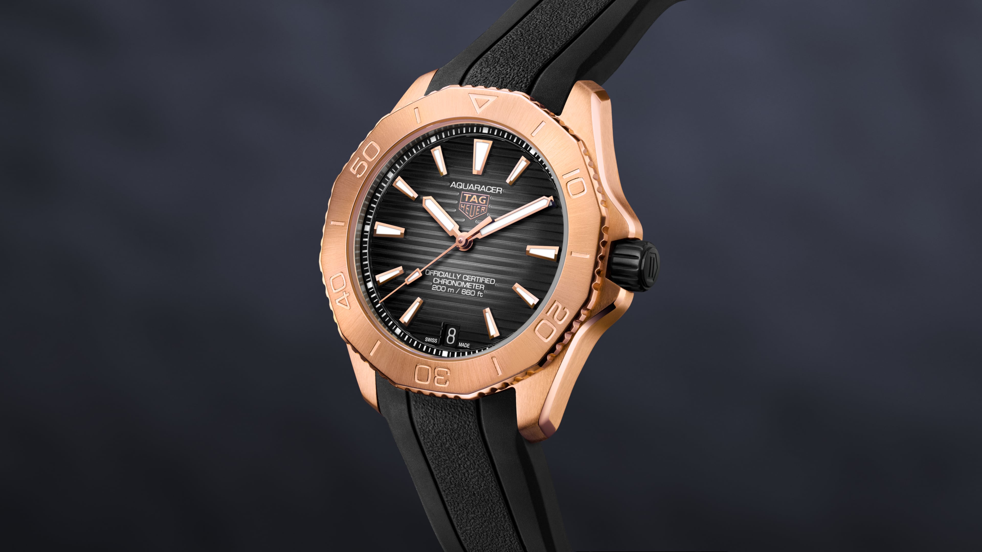 Automatic, 40 mm, Gold 5N WBP5150.FT6199Combining noble materials such as 18K 5N solid rose gold and Grade 2 titanium with high-tensile rubber, this TAG Heuer Aquaracer perfectly pairs sheer elegance with extreme performance and versatility. Water-resistant to 200 metres and ready to raise the bar.