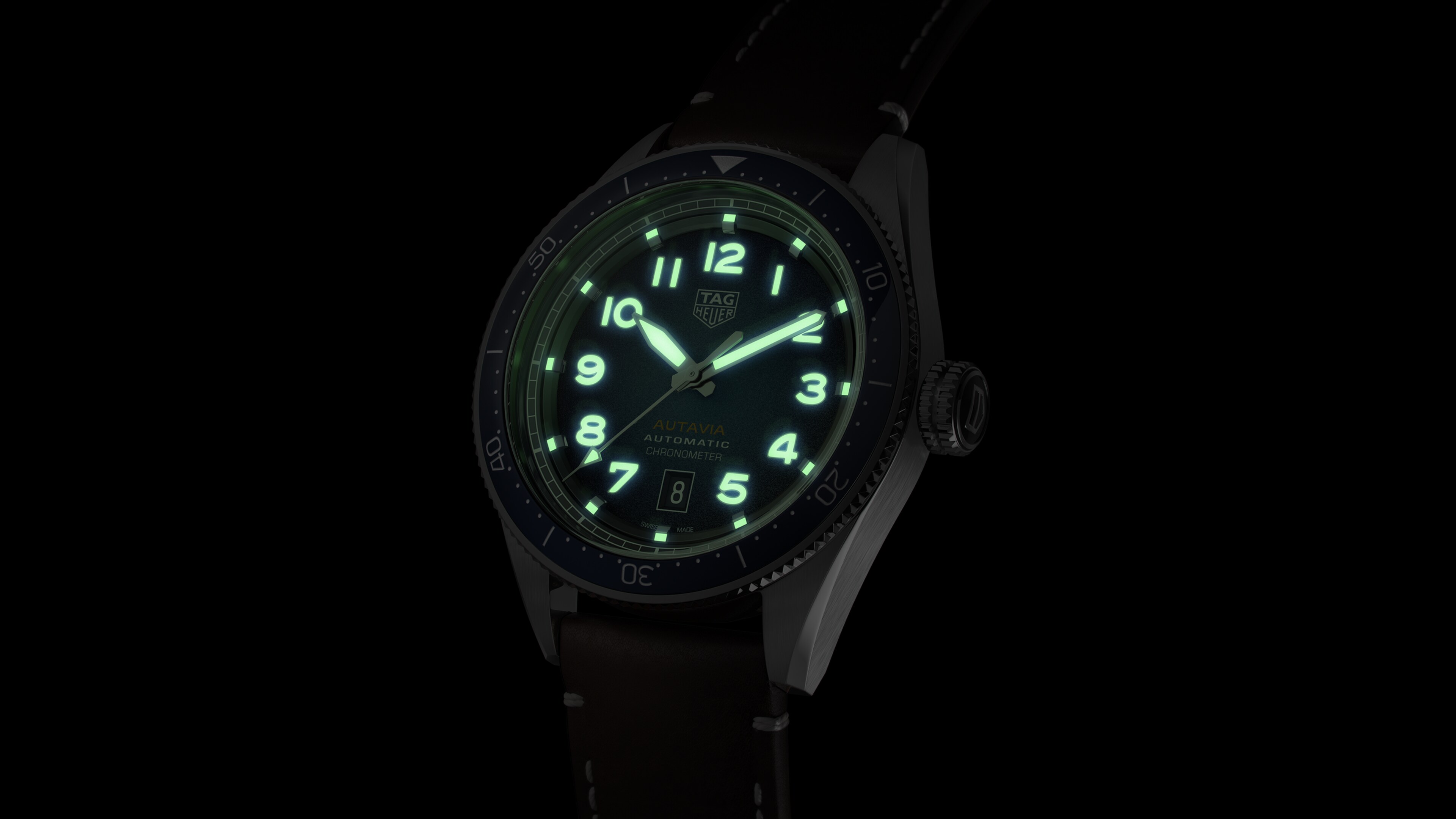 Retro flair, aviation-grade technology: the brown calfskin strap echoes those on Heuer pilot watches from the mid-century; the bidirectional turning bezel, however, is made from very advanced material-science ceramic.