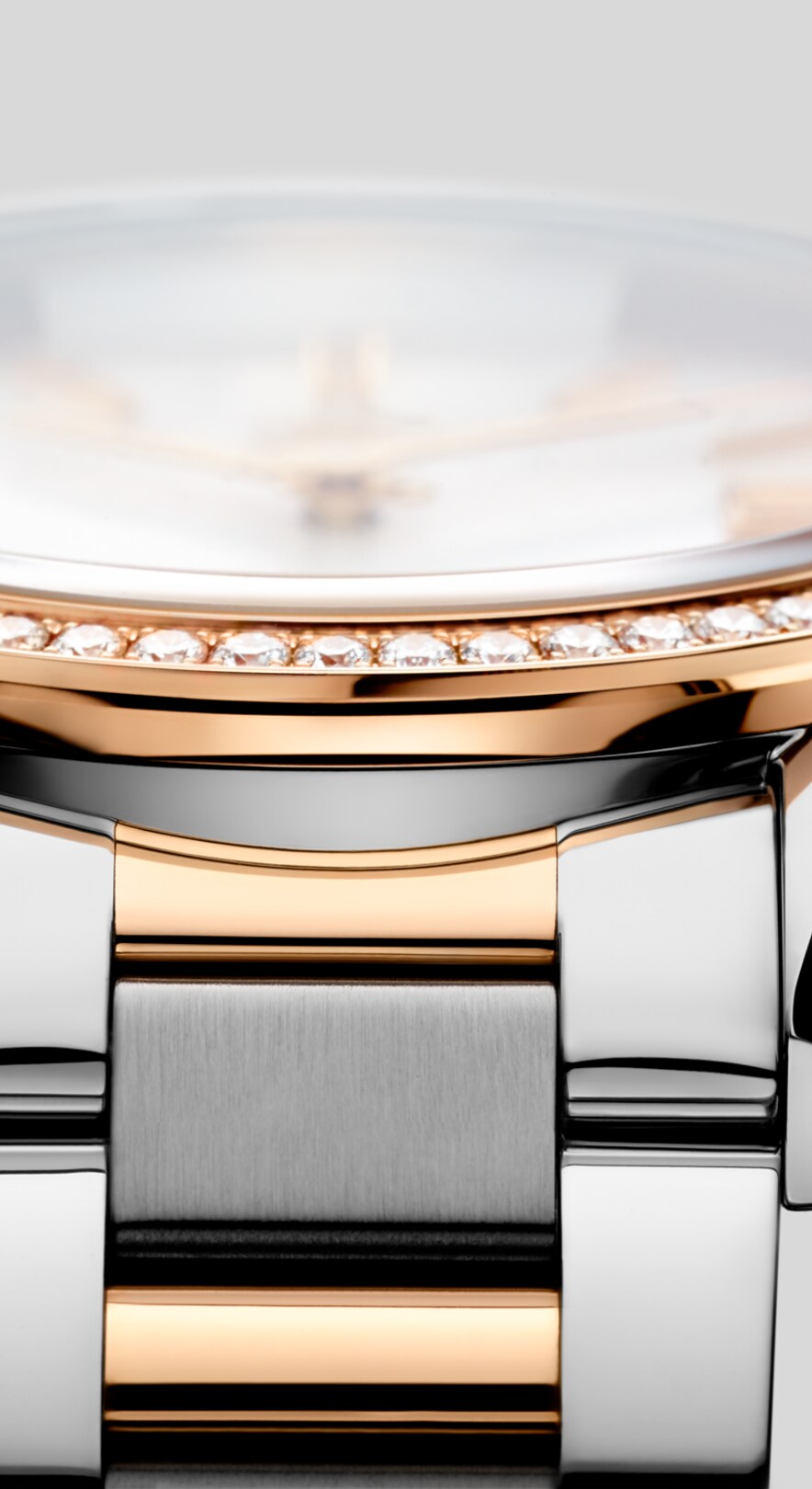 The mother-of-pearl dial is embellished with rose-gold details. The gorgeous H-shape bracelet has outer rows in polished steel and alternating central links in rose-gold capped.