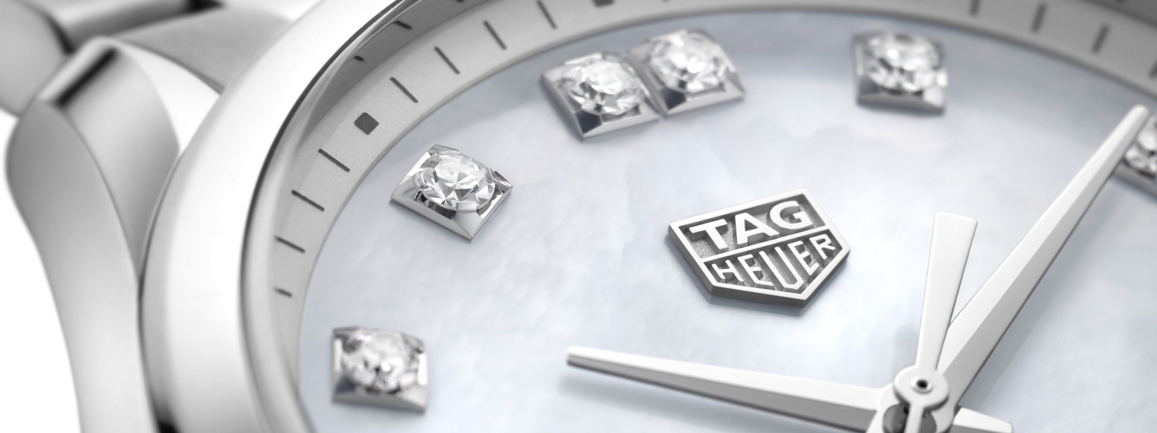 Quartz, 36 mm, Steel WBK1318.BA0652A quartz TAG Heuer Carrera Lady edition, with 36mm stainless-steel case and a white mother-of-pearl dial. The silver-toned indexes are adorned with 12 shimmering diamonds.