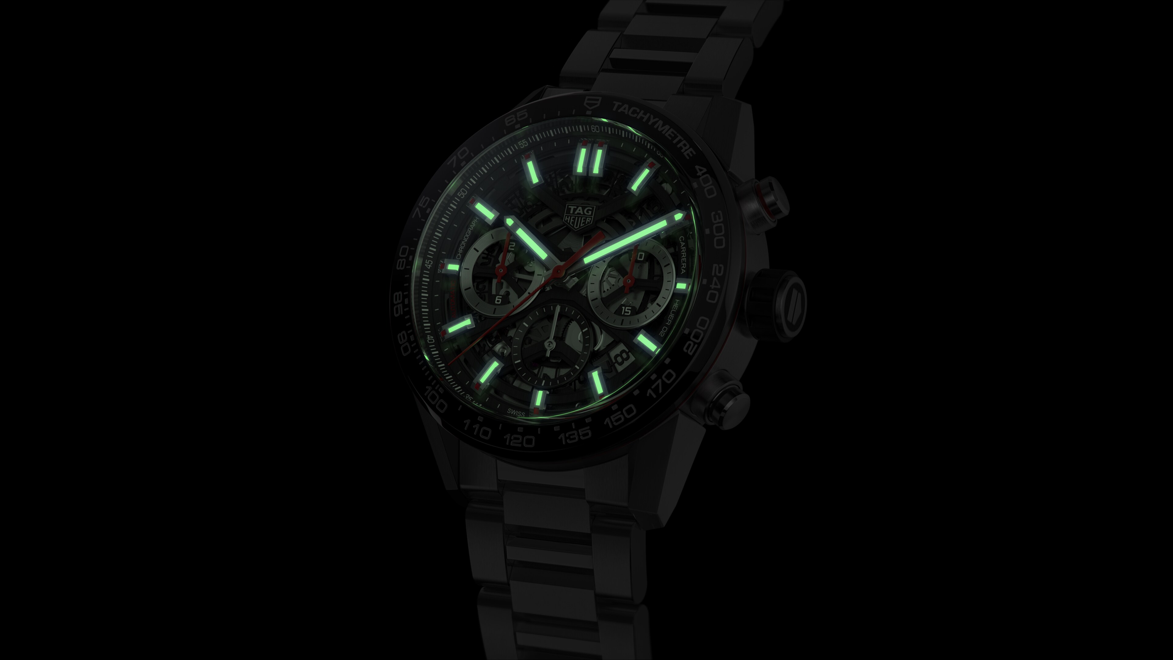 Hitting the red line: The very modern skeleton dial on the 43mm chronograph uses silver tones and subtle red touches to punctuate the design and emphasize the TAG Heuer Carrera’s motor-racing heritage.