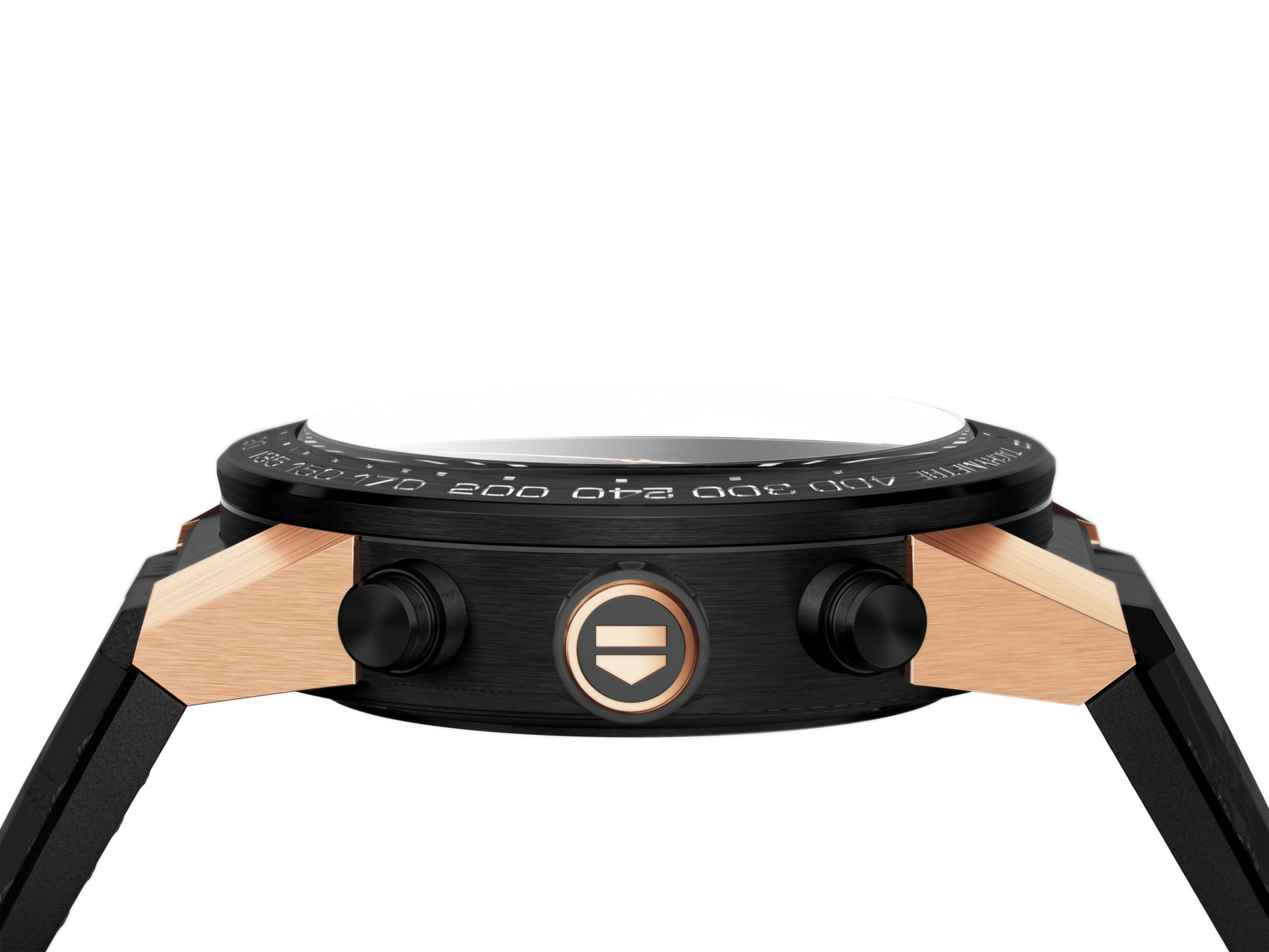 The case is 45 mm in diameter. Water-resistant to 100 meters, it is elegantly fitted by elongated rose-gold lugs to a strap of black matte alligator leather sewn onto black rubber. The bezel is in Black Ceramic.