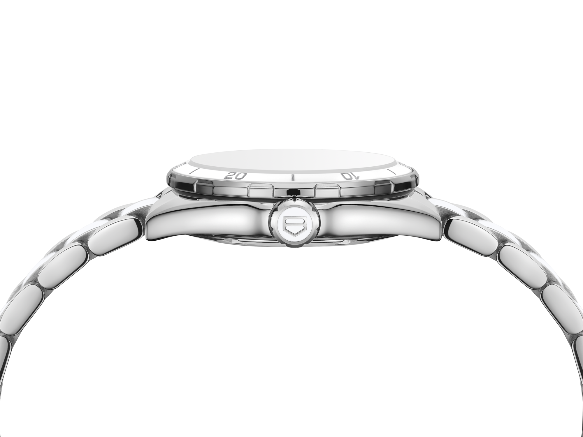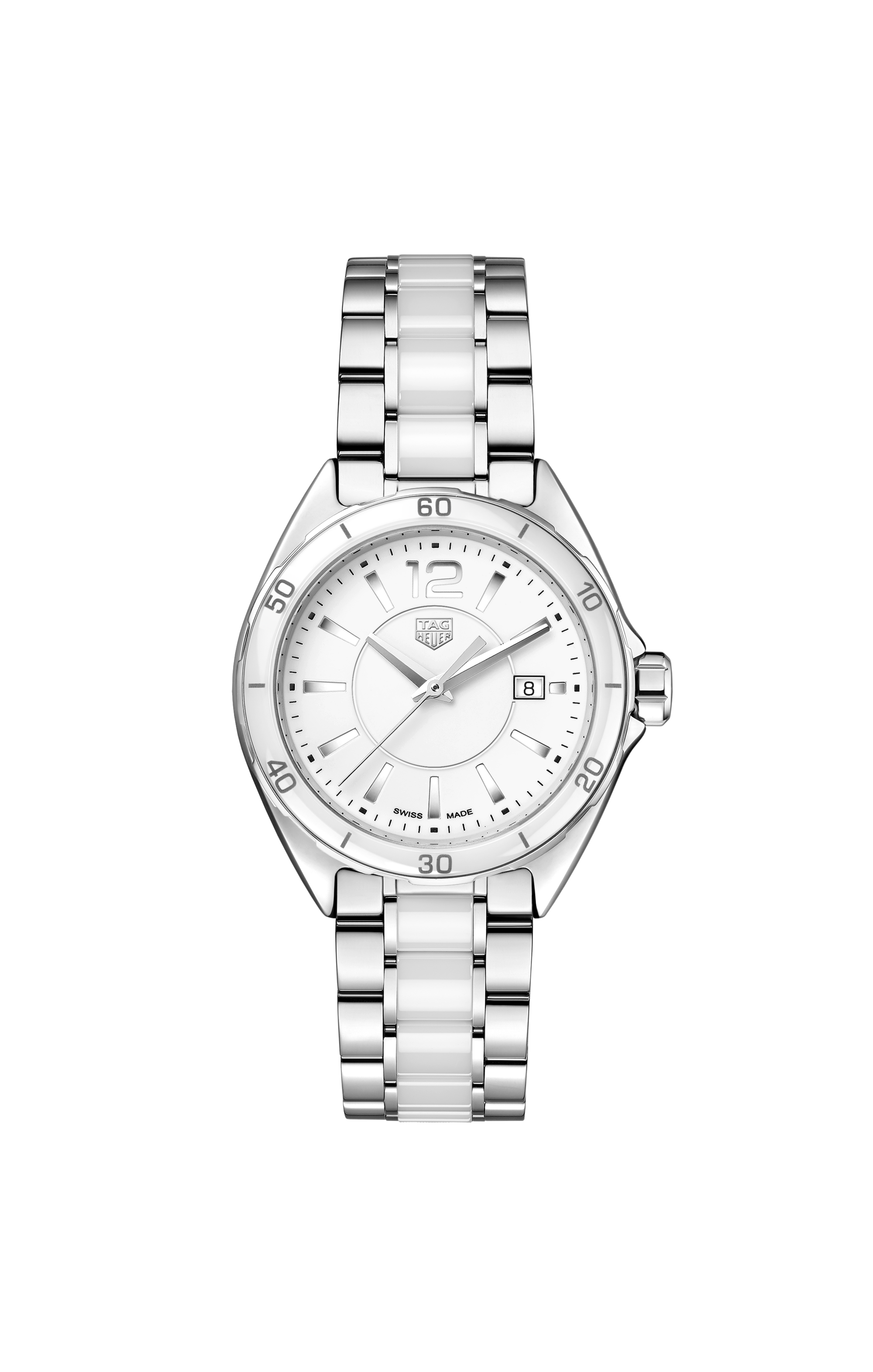 The steel case is trimmed with a fixed bezel of polished steel and white ceramic. The alluring two-toned design continues on the steel bracelet, which has an eye-catching centre row in polished white ceramic.