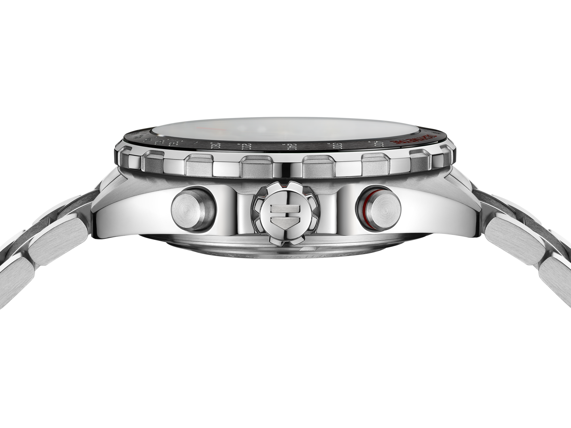 The boldly-sculpted 44mm case is stainless-steel. The fixed tachymeter-scale bezel is ultra-resistant ceramic. Both are hand polished and brushed to perfection.