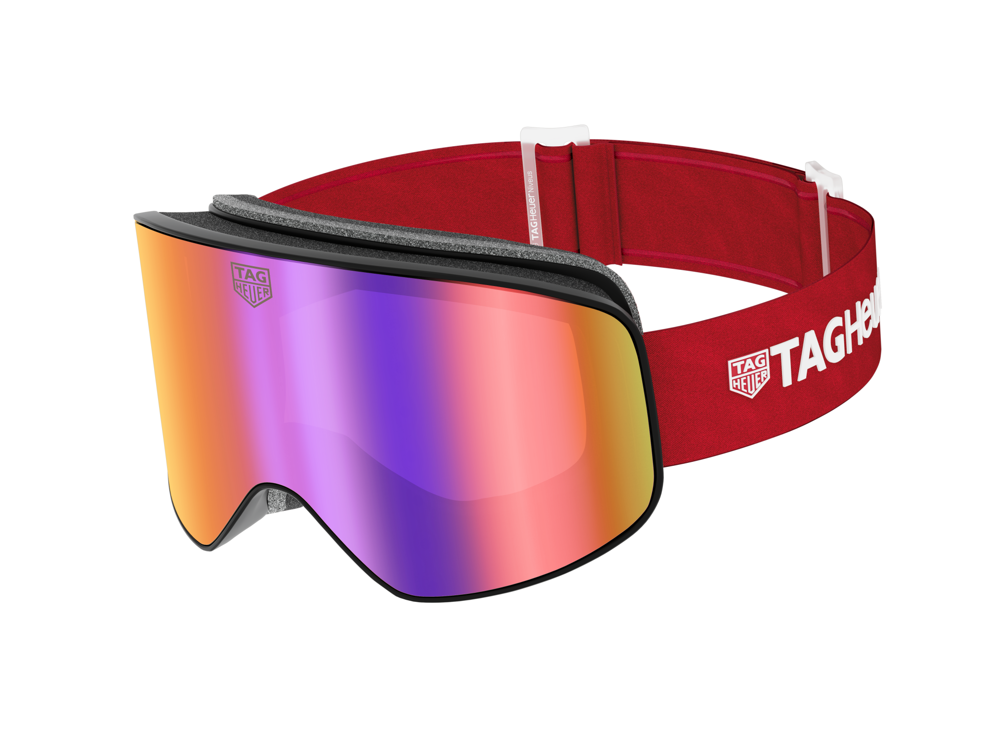 坚固的工程聚合物黑色镜框为护目镜提供稳固支撑,搭配红色(7621 C)弹性头带,既彰显个性风范,又能确保佩戴稳固。对比鲜明的光学白色TAG Heuer(泰格豪雅)标志清晰利落,突显品牌辨识度。