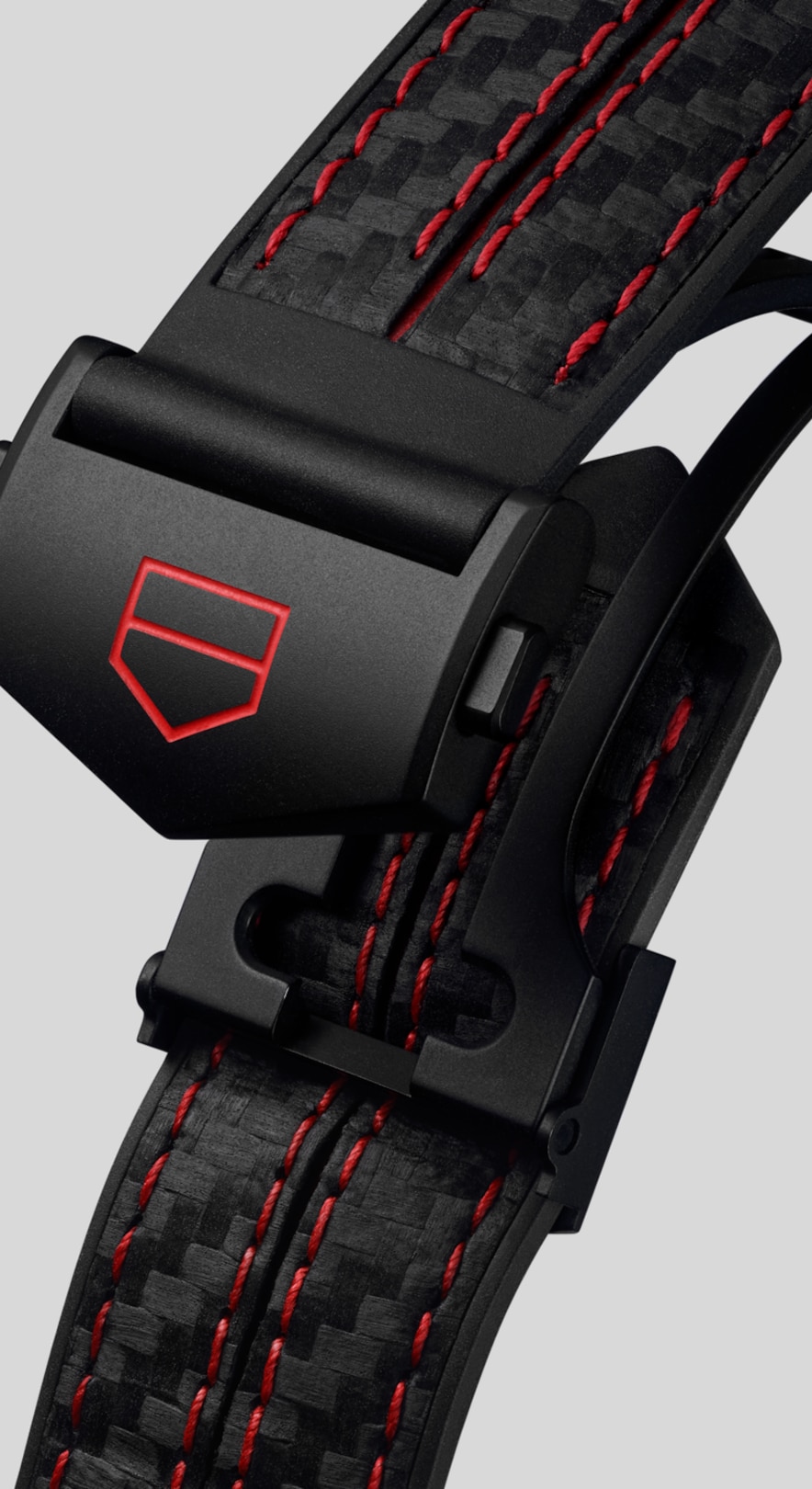 醒目的红色漆面按钮和黑色抛光陶瓷表圈彰显出维修区的紧张与刺激氛围。一体式双材质表带融合碳纤维纹理皮革质感和红色缝线,呈现出运动风格的美学设计。另附赠一条压印F1®标志的粘扣表带,可随心切换,尽显鲜明的赛车风范。