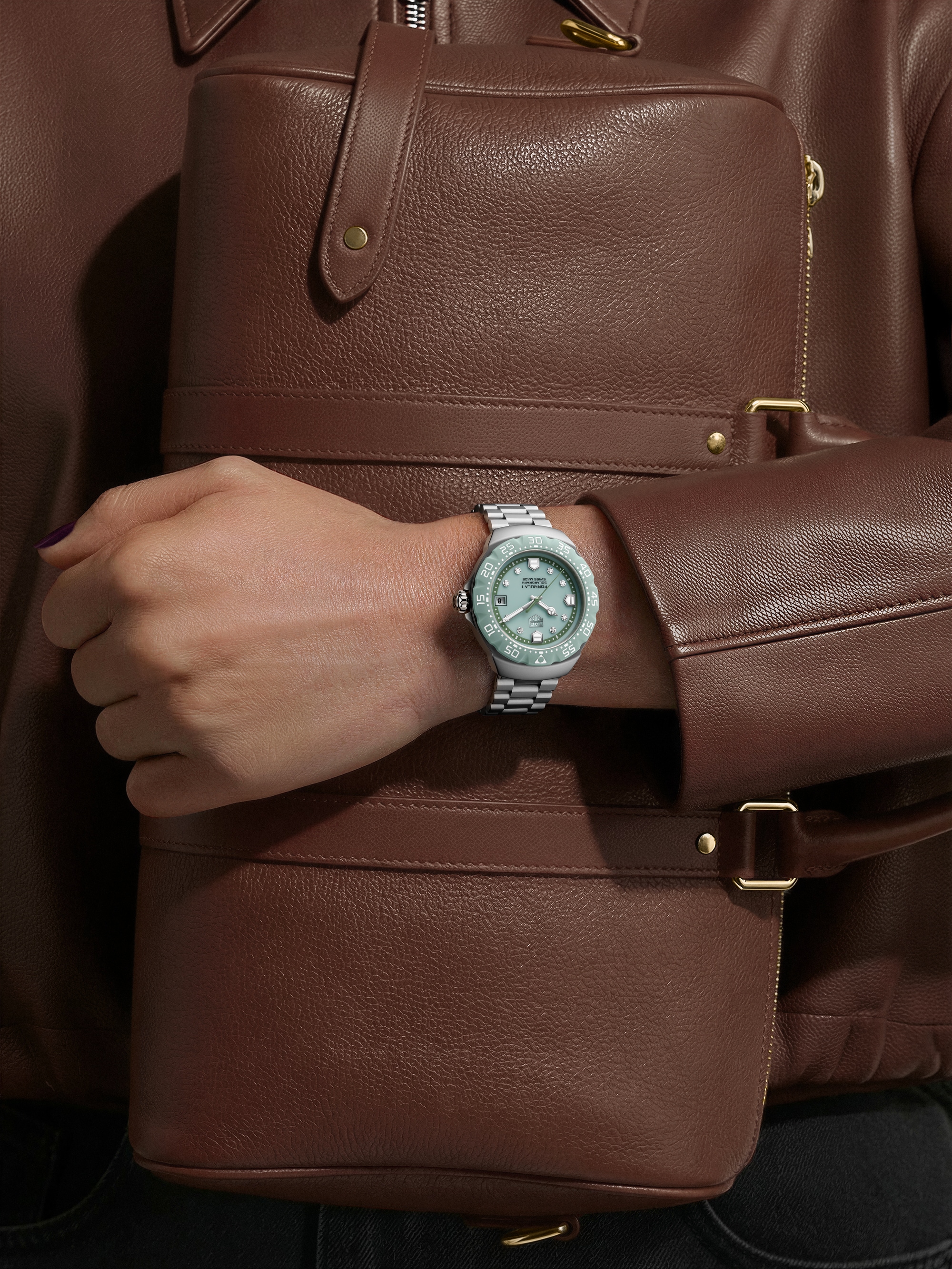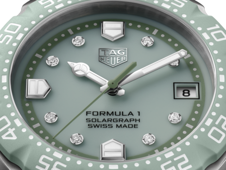 这款泰格豪雅F1系列Solargraph太阳能腕表限量版为该系列的功能性设计注入了大胆创新元素。38毫米表壳和表链均采用喷砂精钢打造,兼顾耐用性和日常佩戴的舒适度。淡绿色表盘上饰有8颗圆形镶钻时标(0.076克拉,H色,SI级净度),搭配品牌标志性盾形刻度,确保清晰读时。采用TH-Polylight打造的双向旋转表圈进一步凸显了这款时计的实用特质。腕表搭载TH50-00 Solargraph太阳能机芯,能够将光能转化为动能,提供可靠的走时精准度与持久续航。