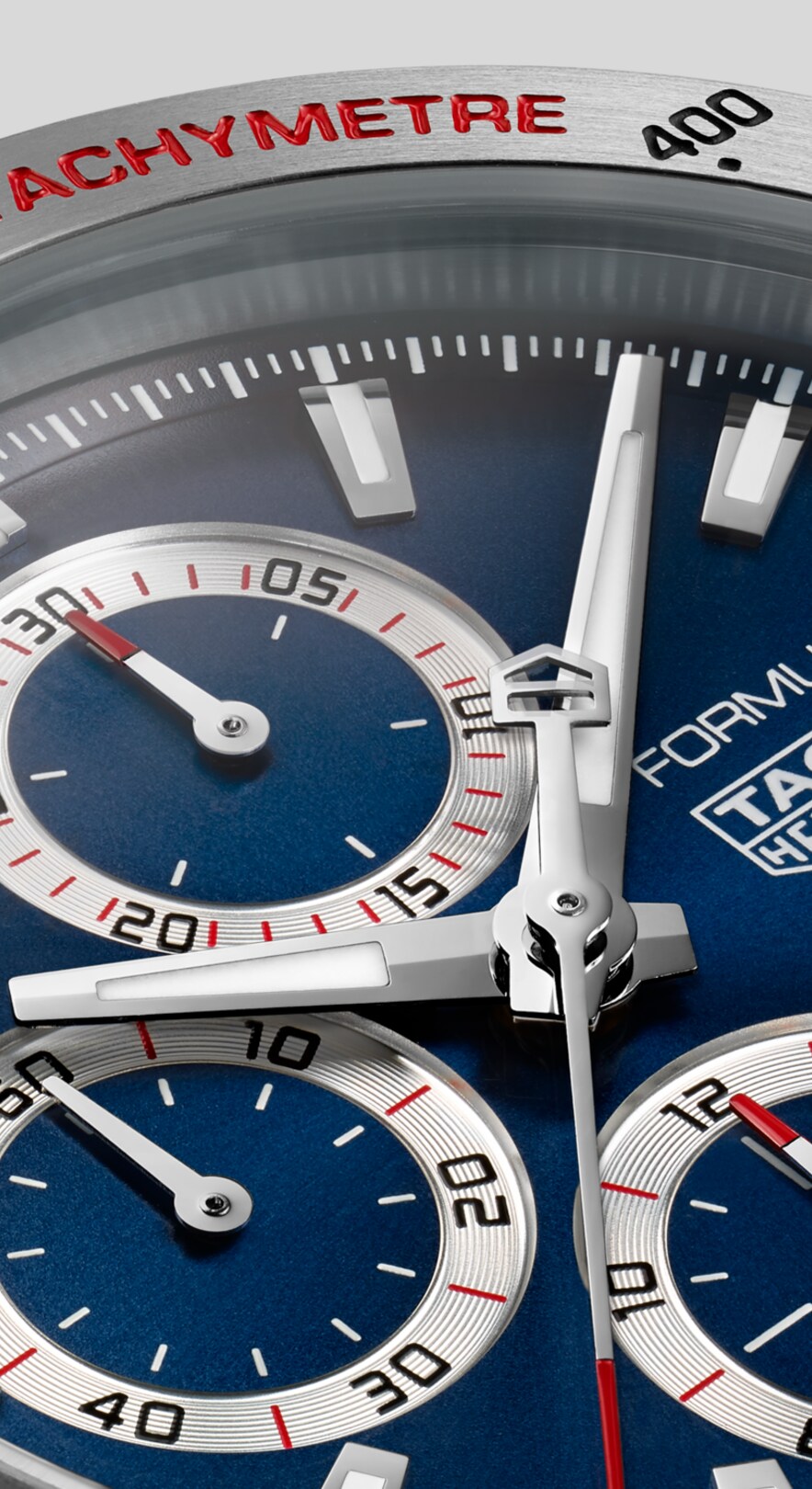 Automatic, 44 mm, Steel CAZ2015.BA0876A 44mm sports chronograph with an iridescent blue dial, blue and silver sub-dials and a brushed and polished stainless-steel case. The fixed steel bezel sports a tachymeter scale for converting distance into speed.
